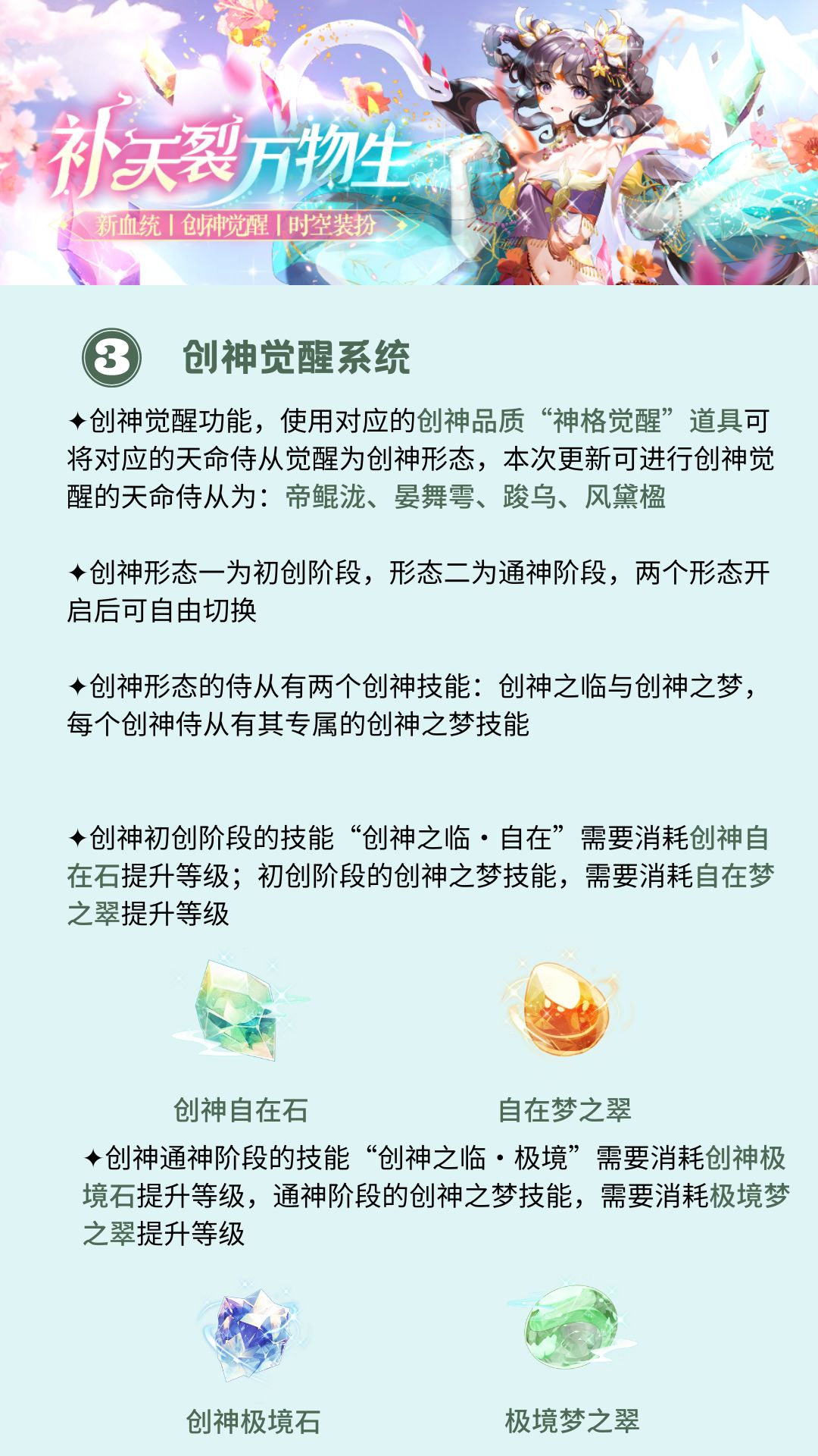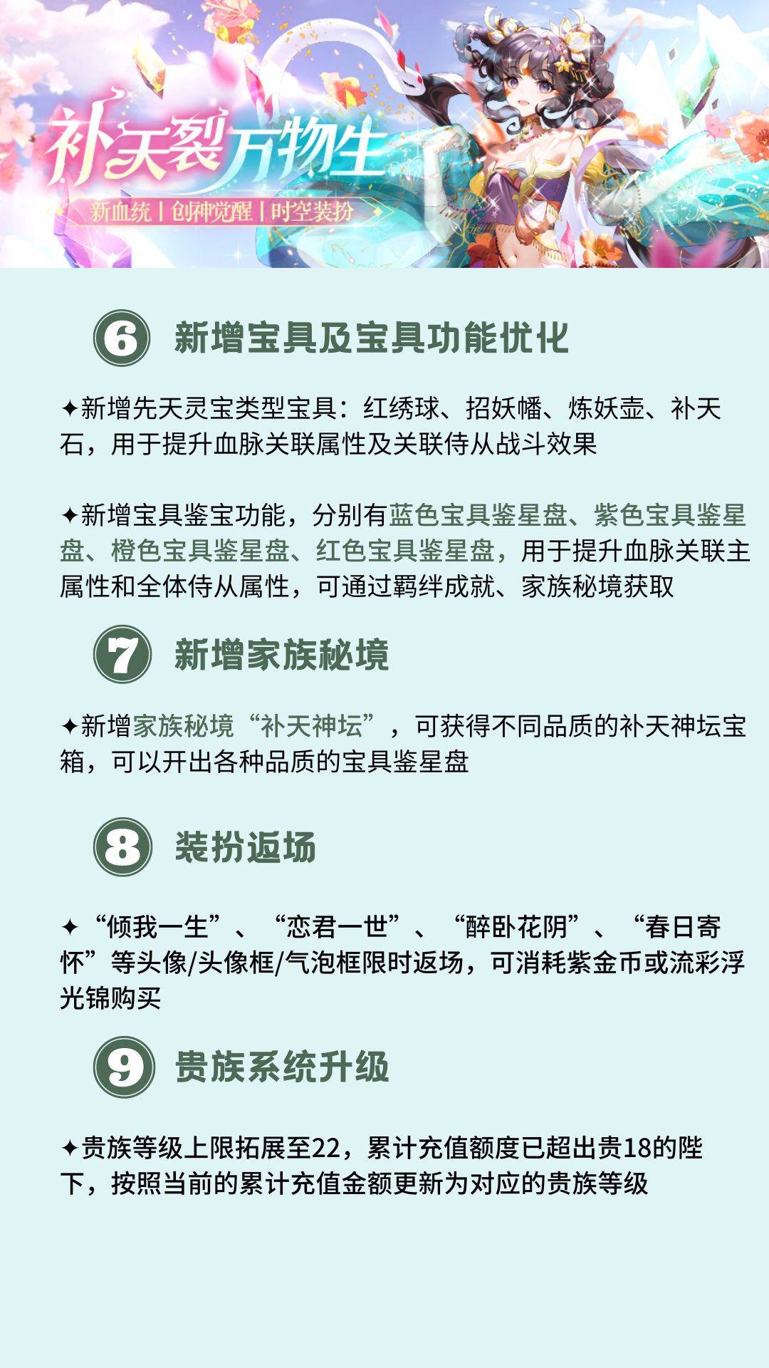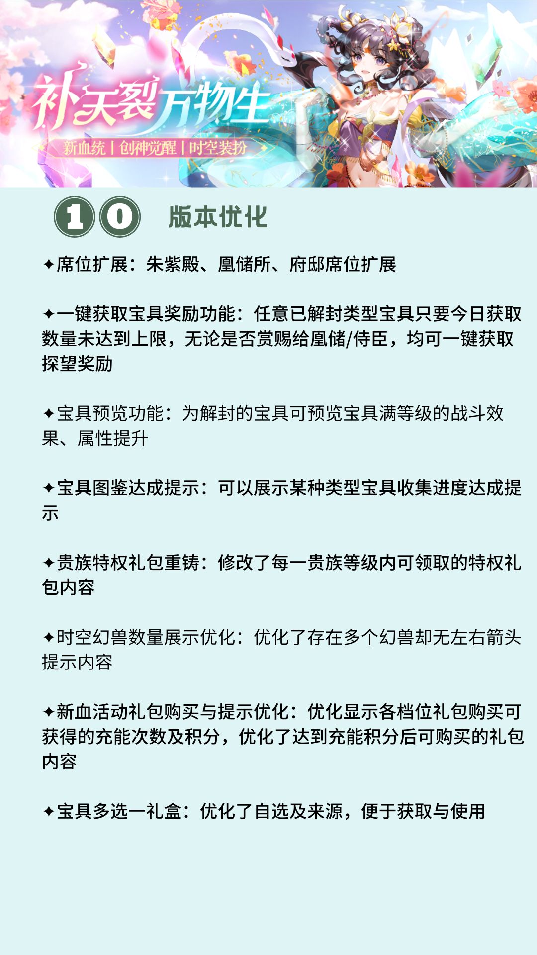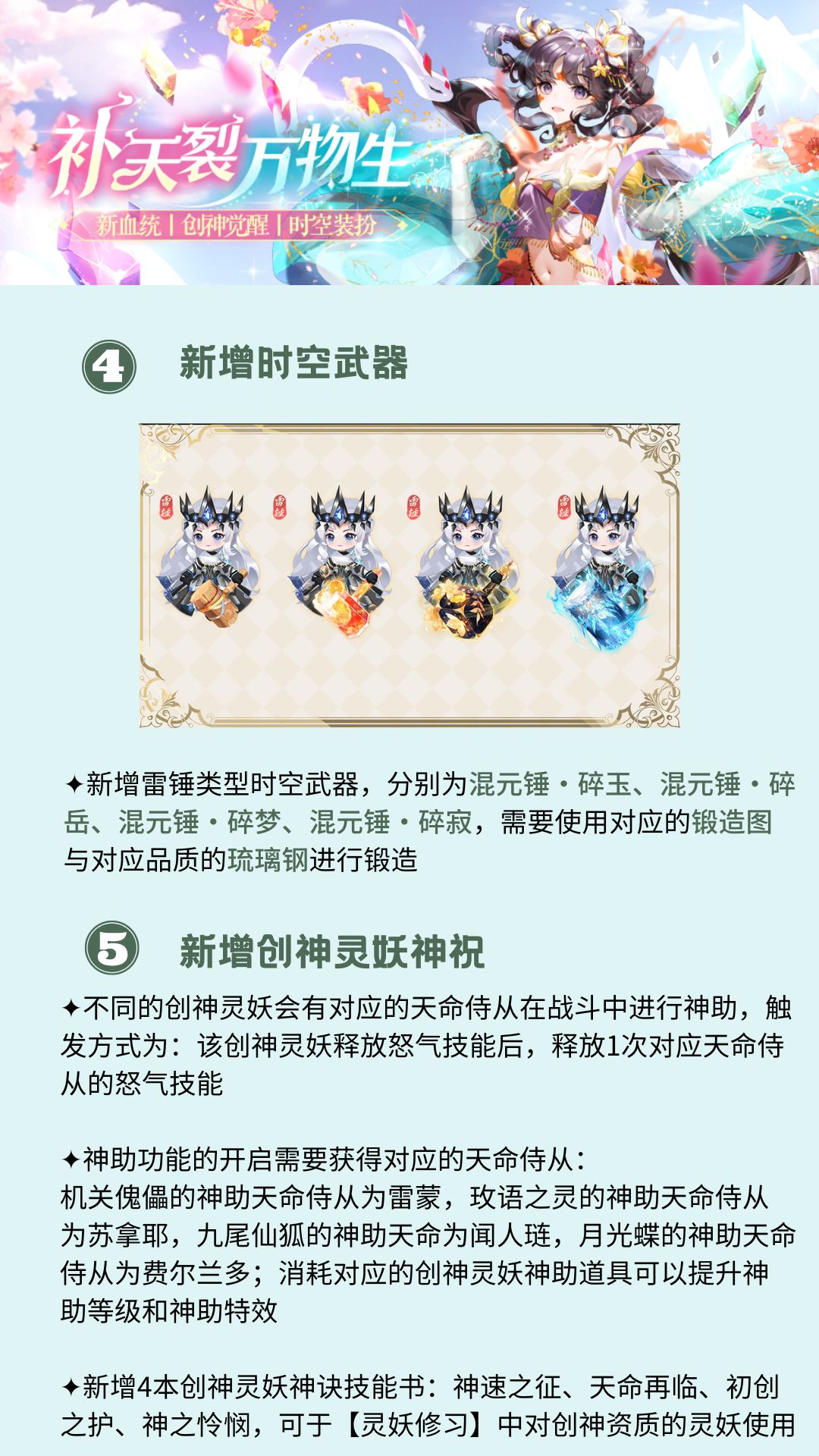 本期更新后,全新娲灵血统天命&国士侍从、创神觉醒系统、新家族秘境、新时空武器、创神灵妖神祝等版本优化,陛下可以点击图片查看版本更新内容介绍,带你快速了解,掌握一手资讯!(๑*◡*๑)