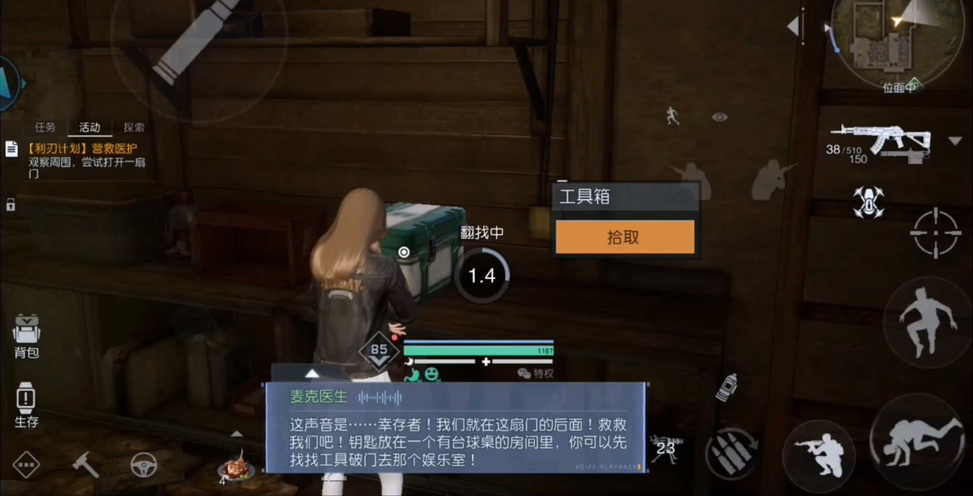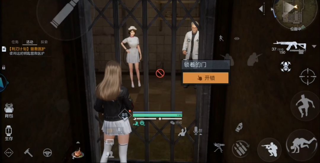 营救医护任务其实就是利刃计划活动中的密室营救任务。进入任务以后先进入地下室。然后找到工具箱拿到撬棍。打开生锈的铁门。进入隔壁房间的桌子上有一个保险箱。密码是762。拿到钥匙,打开铁门。救出麦克医生。对话过剧情以后任务就完成啦~