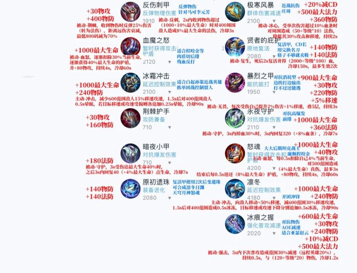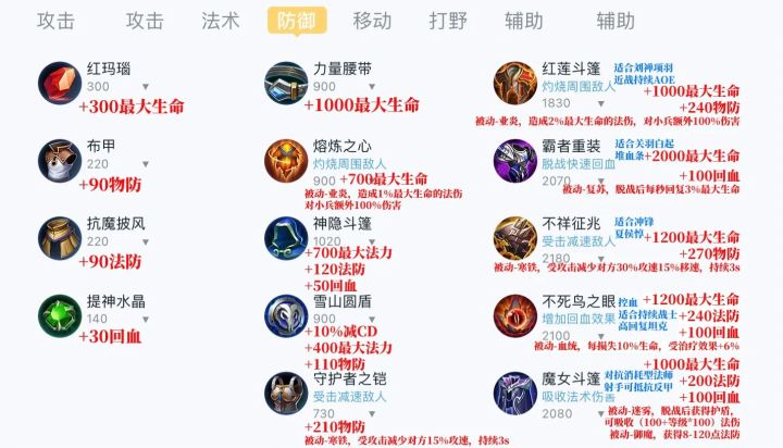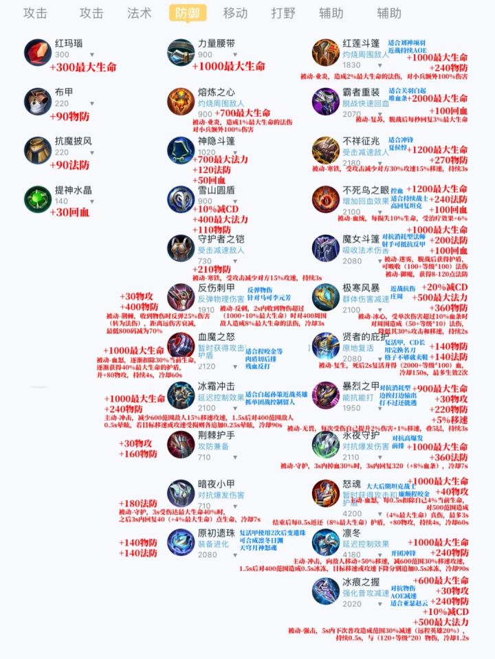 这篇比较特殊的其实就是复活甲(贤者的庇护)和原始遗珠。一般来说先出复活甲的一方比较占优势,如果默认出装格子不够了,可以看情况卖掉鞋子来出复活甲。而复活甲使用一次之后CD非常长,所以用过之后就卖掉改买名刀(攻击页第二列)。再用掉就再卖掉换复活甲。