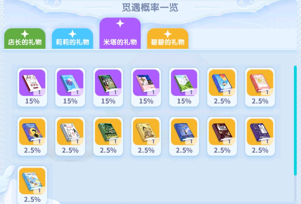 活动期间,完成「幽蓝觅遇」活动任务可获得「雨霁捧花」,将「雨霁捧花」赠送给「书海拾贝」中的角色,可获得对应角色礼物,开启礼物有几率获取各类收藏品。店长也可在「往期藏物」中送礼,有几率获取往期收藏品。