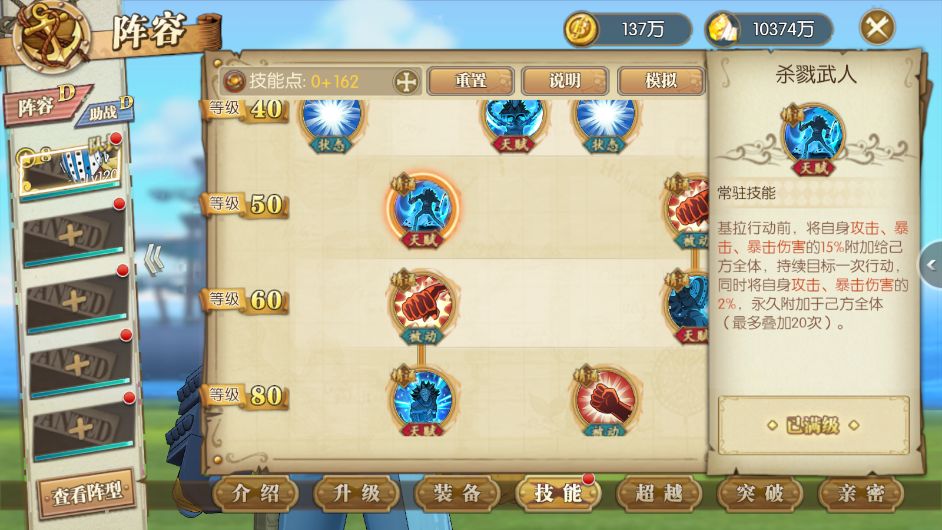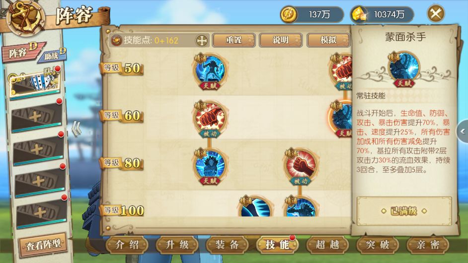 己方男性角色,首回合攻击、暴击提升30%,速度提升15%,超新星提升效果及持续时间翻倍。当前版本,极大提升了凯文迪修的进场属性,基拉替换杰克上场后,凯文迪修的输出将会更高,只需要调整凯文迪修的速度了。
