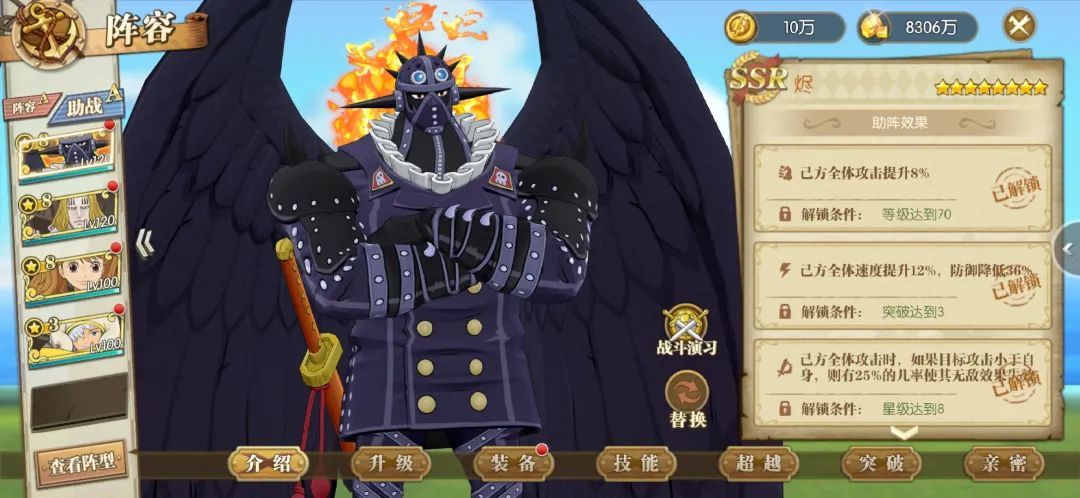 助战方面:烬可以整体提速和概率免疫无敌,布玲可以保证后两排输出稳定出手,奶昔可以清除人物负面状态。霍金斯的助战位可换润媞,SSR凯多,UR龙人凯多。