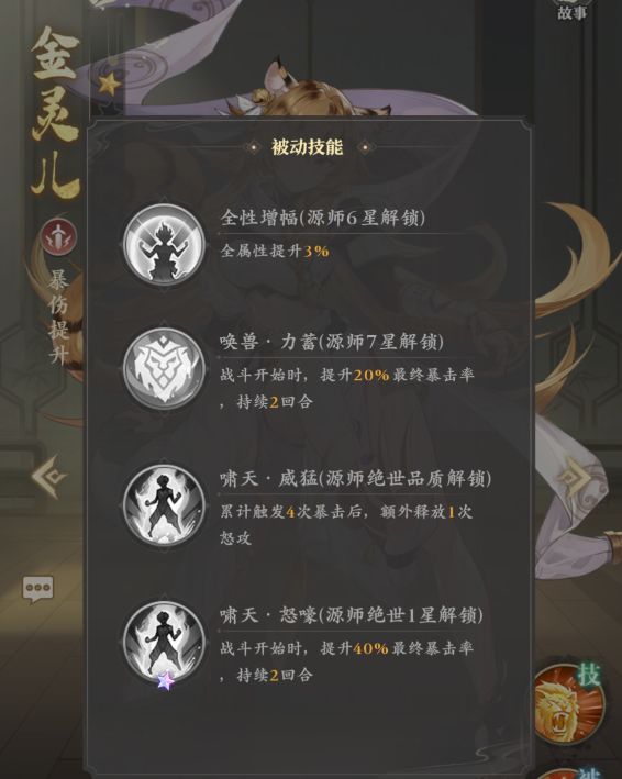 金灵儿作为这个队伍的核心角色不仅能和其他两名以上的虎属气运角色组成提高高额爆伤和免伤的羁绊,自身达到七星和绝1时还能分别提高20%和40%的暴击率。