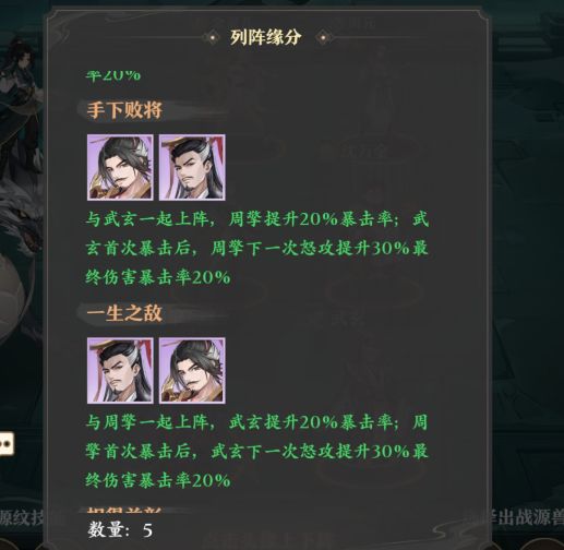 周擎与武玄一起上阵触发羁绊可以使双方提高20%暴击率并且提高首次暴击后怒攻的30%最终伤害与20%的暴击率,作为紫卡前期获取难度升星难度低,两者一起上阵暴击率提升显著十分适配重明翎这件源兵。