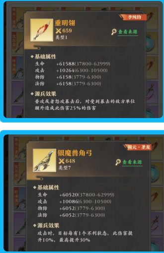 将同为30级基础评分相近重明翎与银魔兽角弓进行对比只看他们的源兵效果,不难发现在两件源兵同时吃满效果的情况下银魔兽角弓会比重明翎高出5%的伤害,并且银魔兽角弓不需要触发装备的角色具有很高的暴击就能触发源兵效果,在各类阵容中都十分通用且实用,说它是现阶段使用门槛最低提升最高的输出类源兵也并不过分。