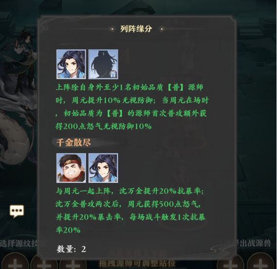 沈万金与周元一起上阵触发羁绊可以让周元在沈万金普攻两次后获得20%的暴击率,能够很好触发重明翎被动。