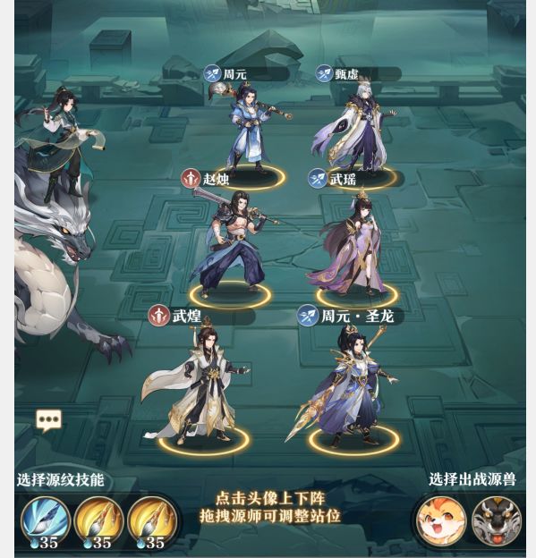该阵容出战顺序如上图,打源兽森林时伤害逻辑如下(注:本阵容中所有角色的专精最好均达到10级):甄虚先出手使用大招,给敌方挂上四种负面状态以便于队伍主C能够完美触发银魔兽角弓的效果,接着武瑶出手释放怒攻给boss挂上【凰雷】效果,圣周出手大招也可以给敌方挂上受伤效果,然后由周元进行输出,赵烛出手使用大招可以补伤害,武煌在队伍中仅为羁绊辅助作用。