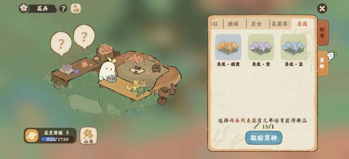 桃花值好不容易才到20,获得了紫色的鸢尾花,培育了蓝色和橘黄,看攻略合成其他的颜色还需要白色,白色需要200桃花值,太难了😭😭😭