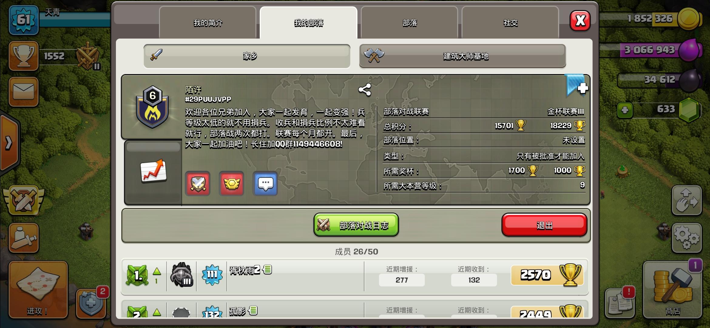 说明:迎各兄弟加入,大起发育,一起变强兵等级太低的就不用捐兵。收兵和捐兵比例不太难看就行,部落战两次都打。联赛每个月都开。最后,大家一起加油吧!长住加QQ群1149446608