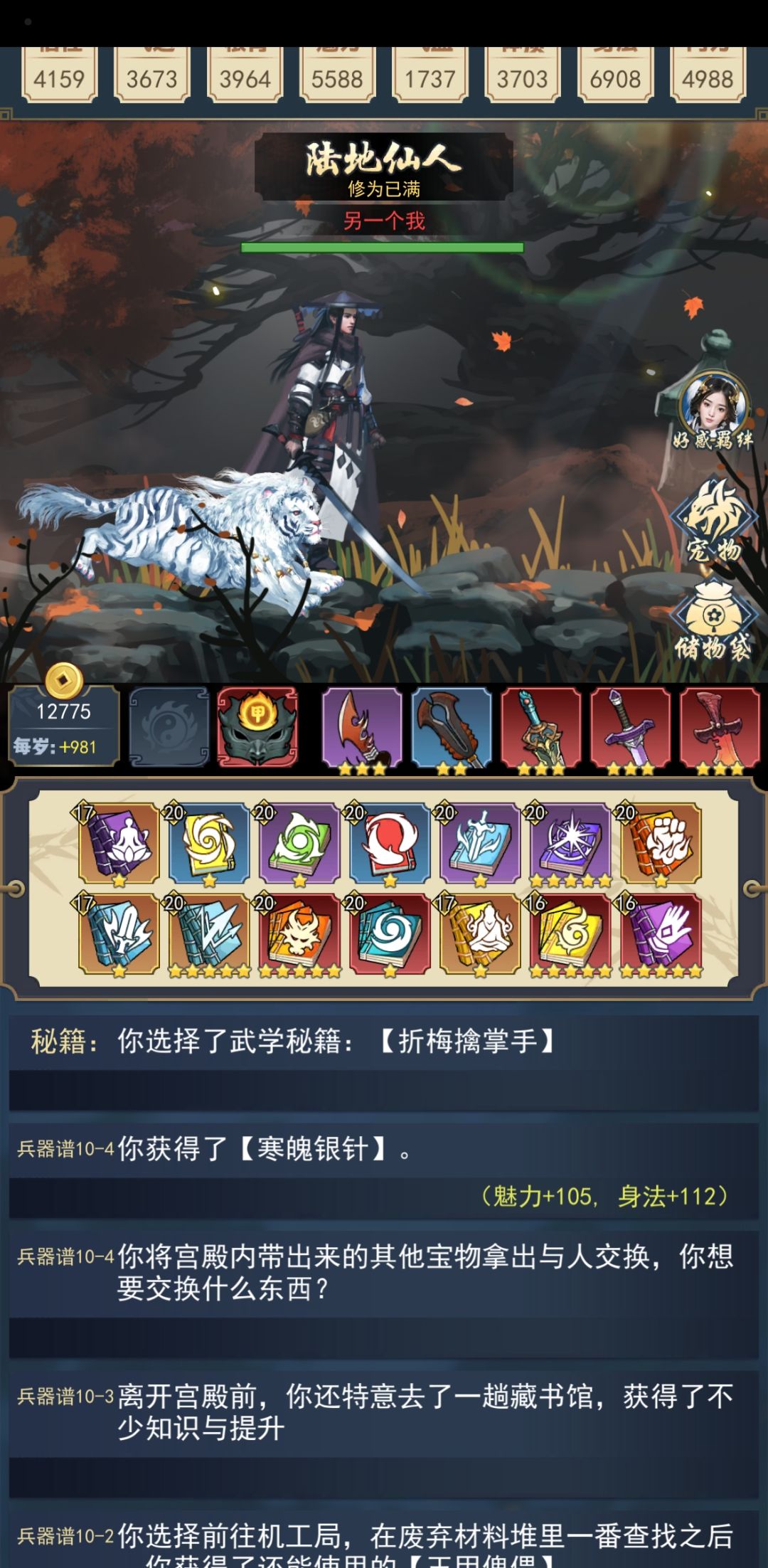 2. 优先选择最终会升级到5星的秘籍。途中选择金钱和功法。全部选功法,尽量触发狗屎运,让最终10本秘籍尽量是随机出来的。这样每一层的三本秘籍可以尽量补全。图中折梅手可以替换成打狗棒法。我这里是因为随机到折梅手所以可以少买一本秘籍就选择了它。