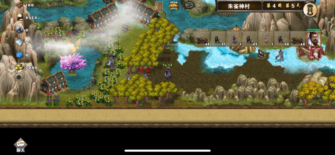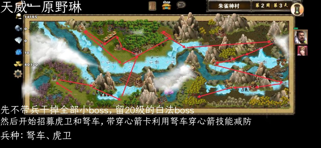 打法思路:这一关核心装备是蓝缎头地图上的敌方武将基本全部都会冰你,还有玄武轮流来冰没有蓝缎头一定会欲仙欲死。咳言归正传没有蓝缎头就尽可能在打敌方将领之前停留一天方便刷开局不被冰第一回合优先清理士兵数量还是挺多的,要注意的是地图右边中间那个白法将领我方貂蝉模型的副将手上的冰封和禁锢要对着数量最多的兵轮流使用不要让他近身,不然打起来非常难受。最后地图右边那里有市场可以兑换材料木头和铁矿哪个不够就换哪个,剩下的就是招募虎卫和弩车大概第五周就可以去打最终武将了,打之前把虎卫分成三组参考图片里的站位。弩车的穿心箭技能可以降低敌方单位防御建议轮流使用。
