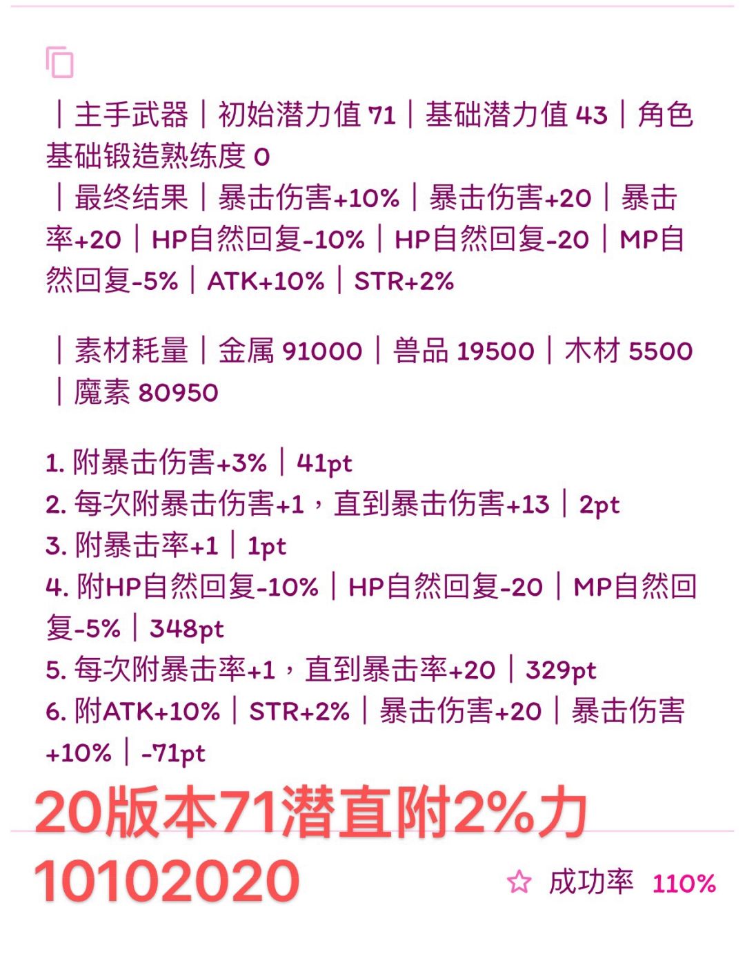 直附相对于19附好再进化就简单的多,这里贴出的是71潜力 物爆伤爆伤暴击外可以稳附的百分比力量