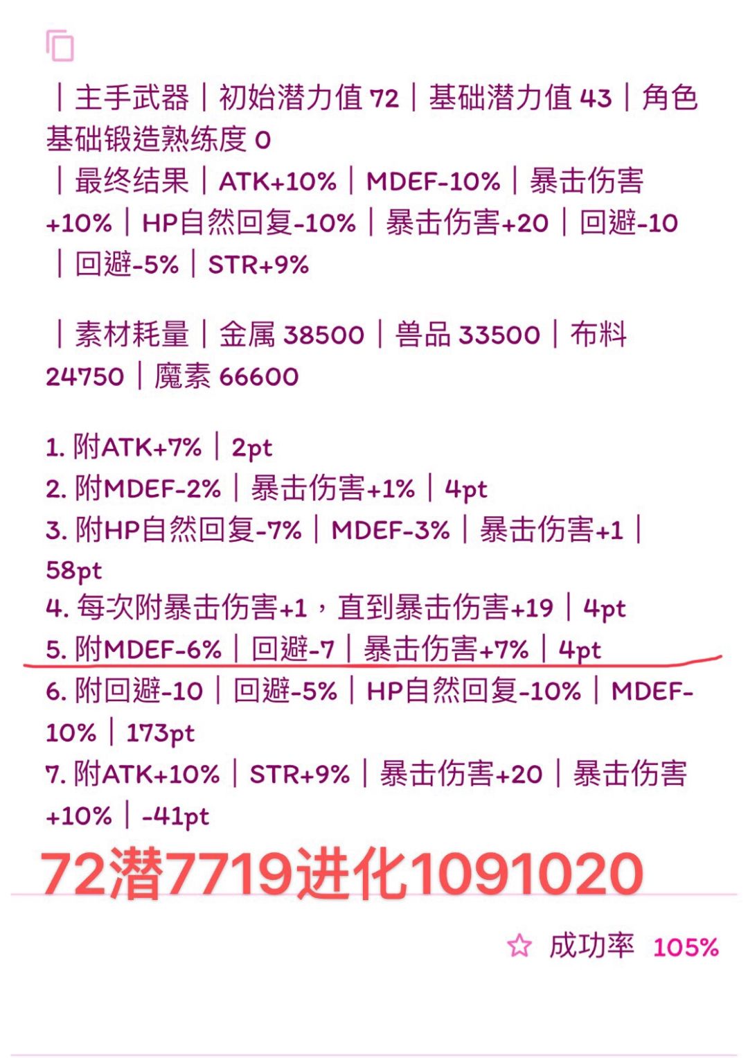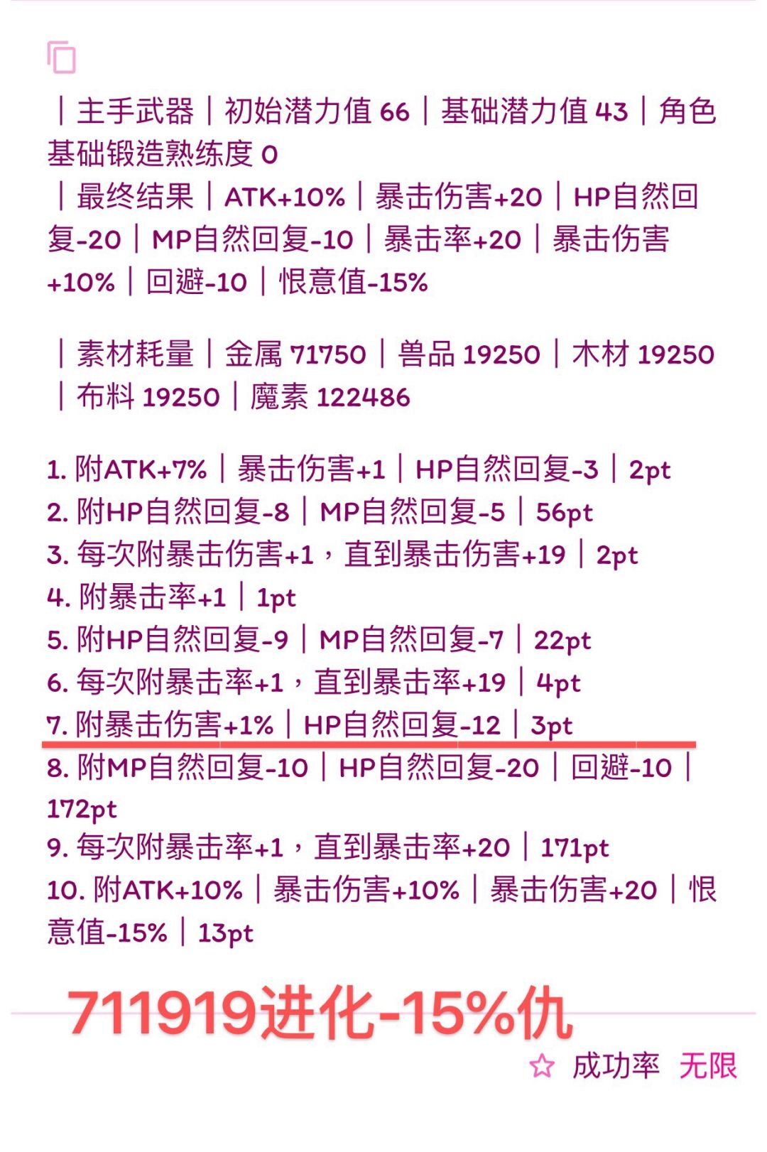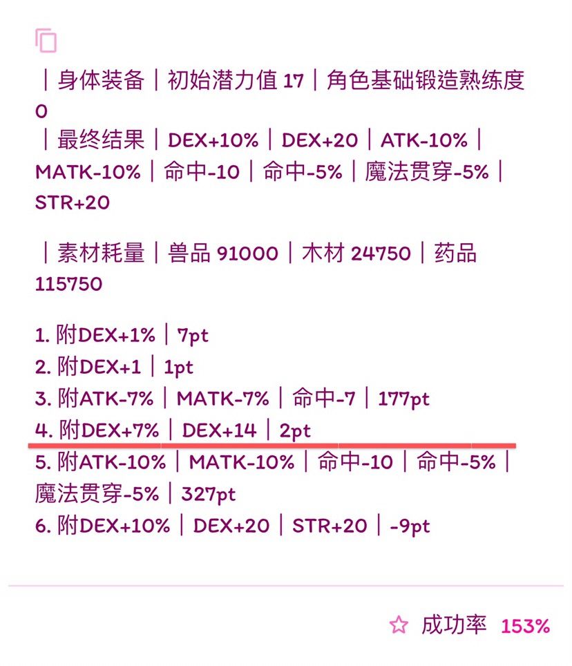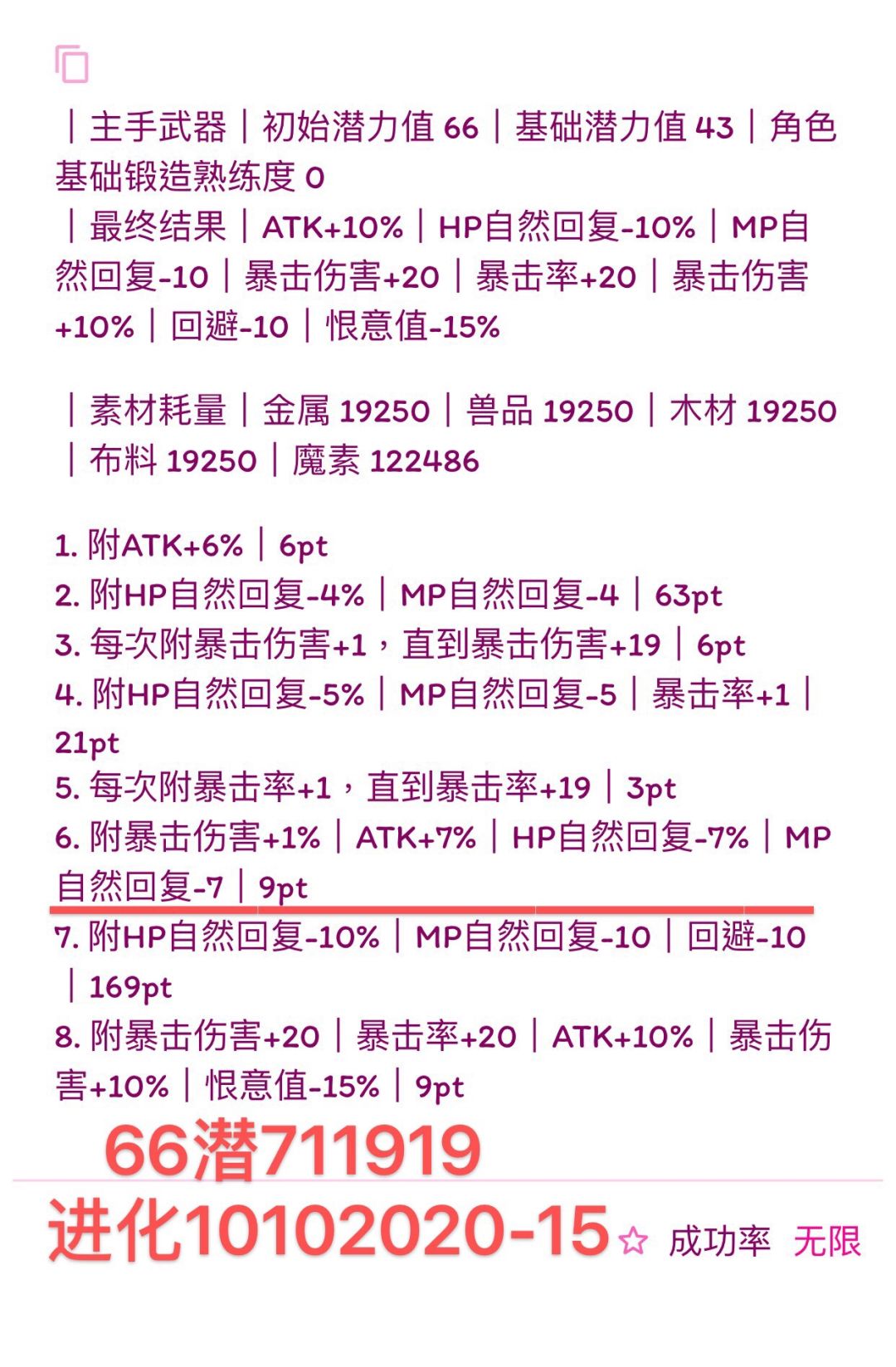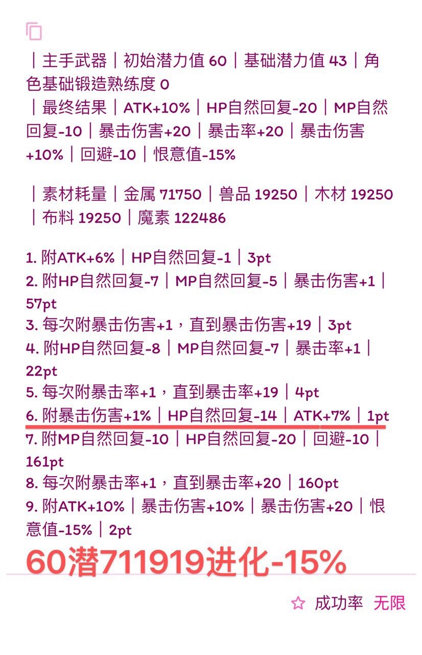 (我写的比较快,诸位若要使用公式,首先检查横线前1.是否有剩余潜力,2.属性条是否最多六条,3.19版本:HP自然回复最多-14、HP自然回复-7%、MP自然回复-7、MP自然回复-3%。超过六条就本版本没法附了,没有剩余潜力下版本就无法进化,超过19版本可退数值附魔也失败,如果使用有发现上述问题可以在下面留言,我会尽快改,希望能带来帮助)