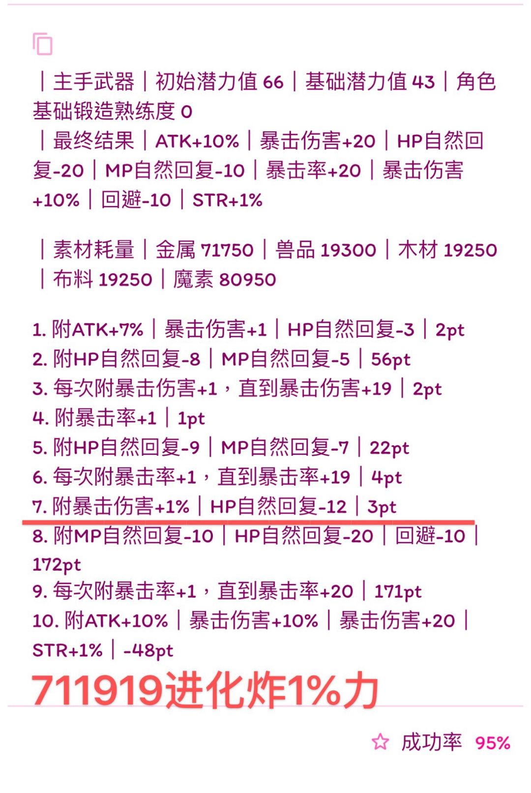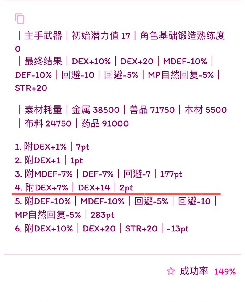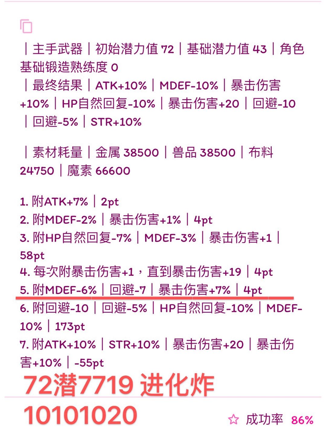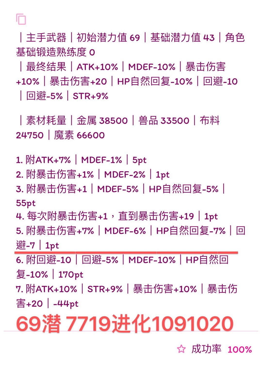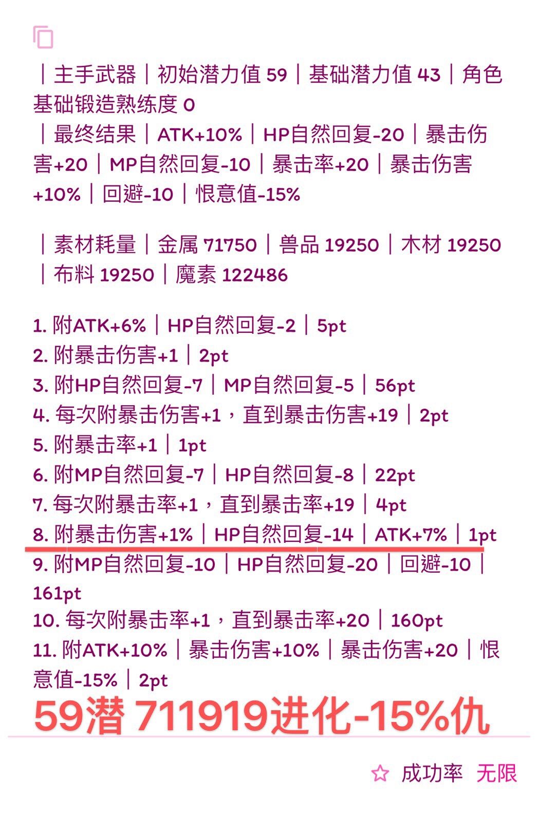(我写的比较快,诸位若要使用公式,首先检查横线前1.是否有剩余潜力,2.属性条是否最多六条,3.19版本:HP自然回复最多-14、HP自然回复-7%、MP自然回复-7、MP自然回复-3%。超过六条就本版本没法附了,没有剩余潜力下版本就无法进化,超过19版本可退数值附魔也失败,如果使用有发现上述问题可以在下面留言,我会尽快改,希望能带来帮助)