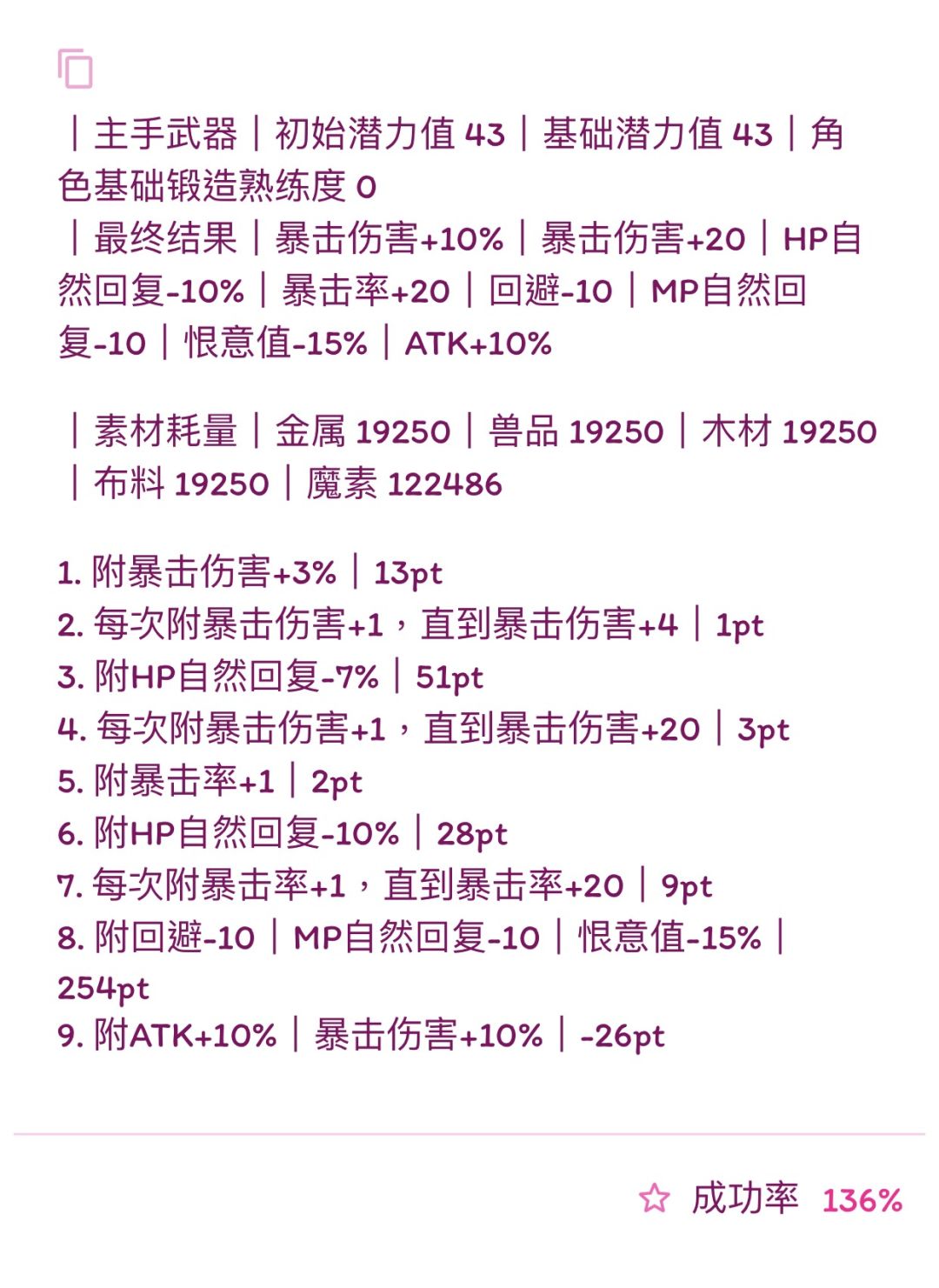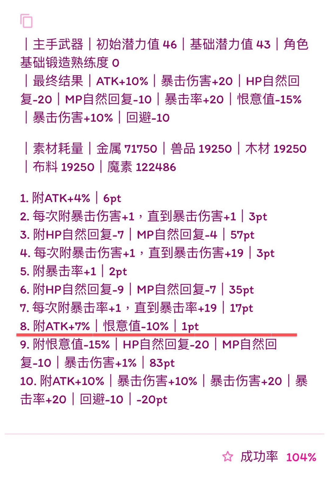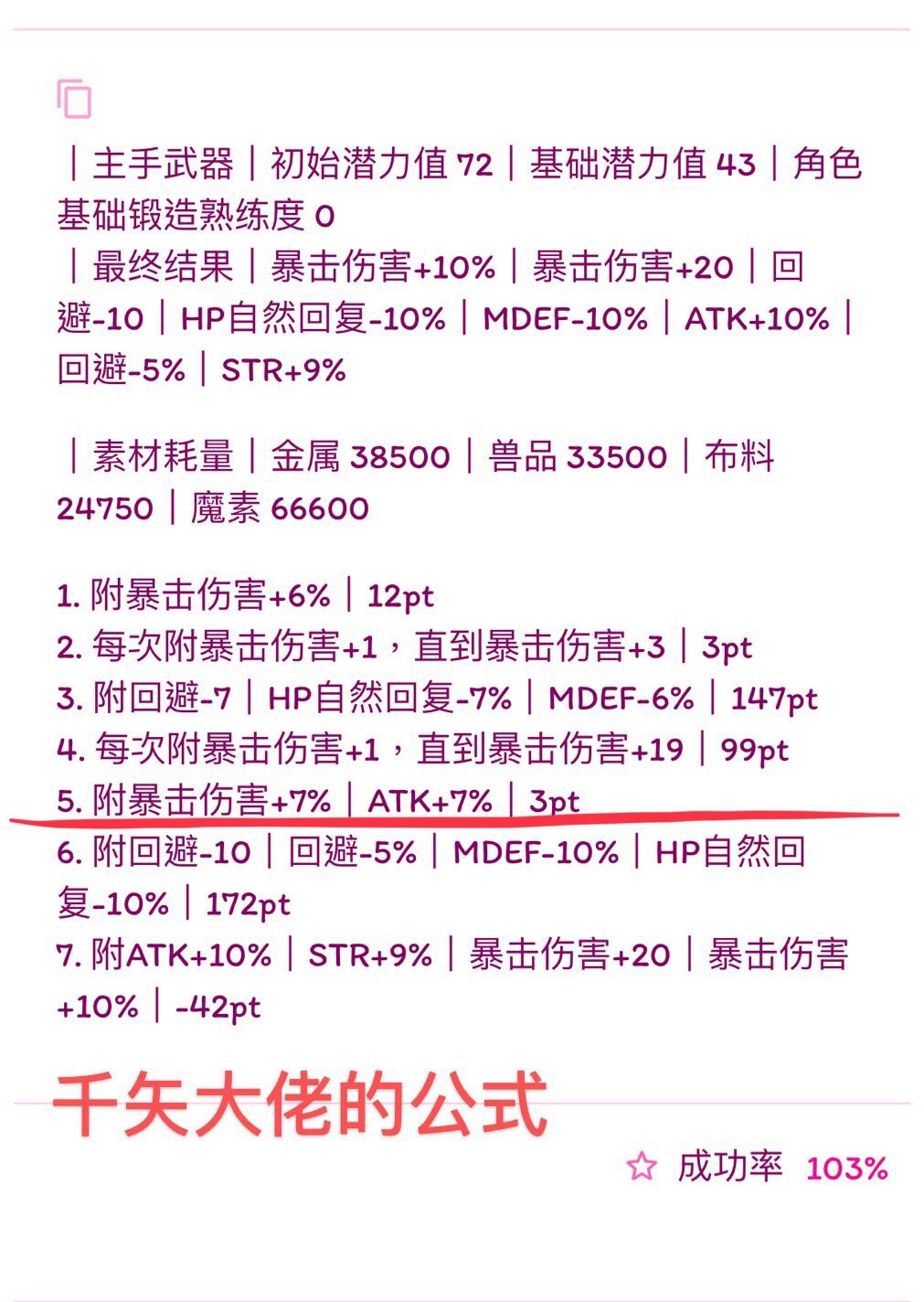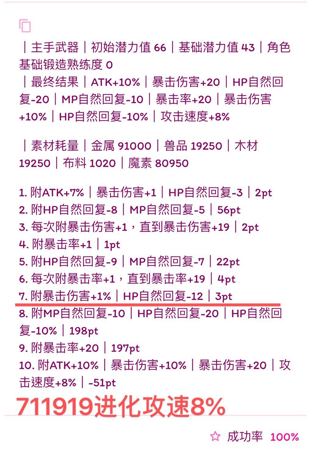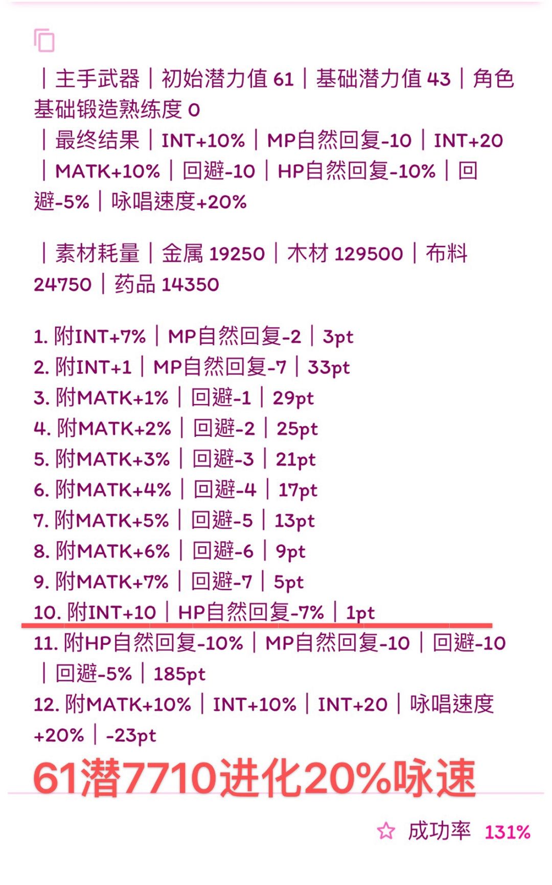 (我写的比较快,诸位若要使用公式,首先检查横线前1.是否有剩余潜力,2.属性条是否最多六条,3.19版本:HP自然回复最多-14、HP自然回复-7%、MP自然回复-7、MP自然回复-3%。超过六条就本版本没法附了,没有剩余潜力下版本就无法进化,超过19版本可退数值附魔也失败,如果使用有发现上述问题可以在下面留言,我会尽快改,希望能带来帮助)