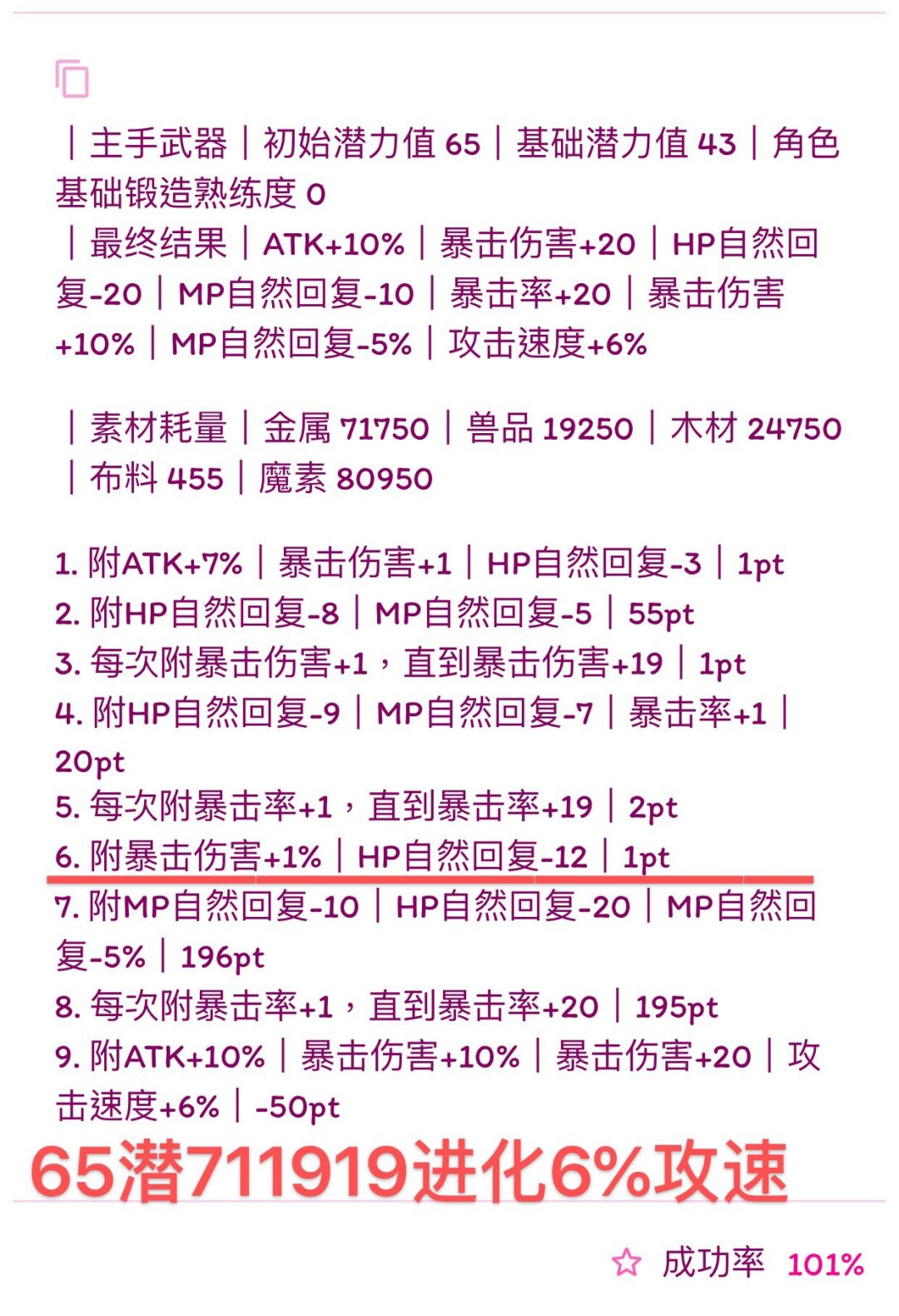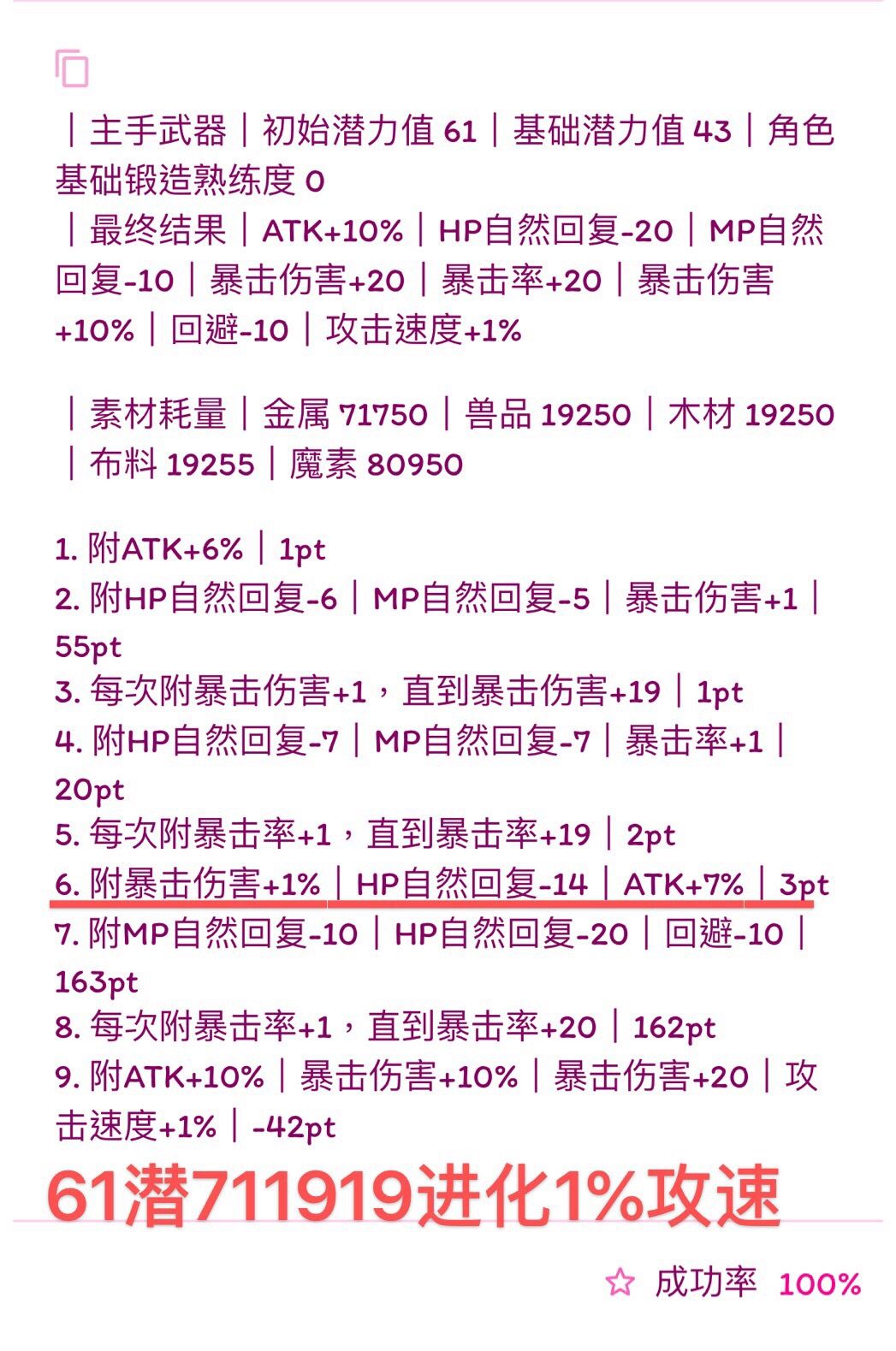 2.61-64潜 711919(61潜附魔1%攻速成功率刚好100%,所以不提供炸百分比力量的式子,62、63、64如要附魔攻速%可以在稳附的情况下继续往上提)