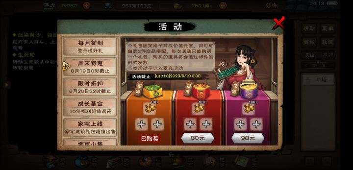 这边有个建议是通过周末特惠尽可能的嫖福利。首先充值6块的,然后购买完不要点击返回商家,直接把后台划掉,然后再重新上号,(再次强调:重新上号后要赶紧再挑个礼包买!)理论上是可以再次买6块的(实际上也可以,自由选择)直接买个30块的(折扣商品选择15根骨资质丹,其他资质丹)这样36块就获得400元宝,1功勋铁券/马车票(100元宝),5顺脉丹(120元宝),30颗资质丹(420元宝)