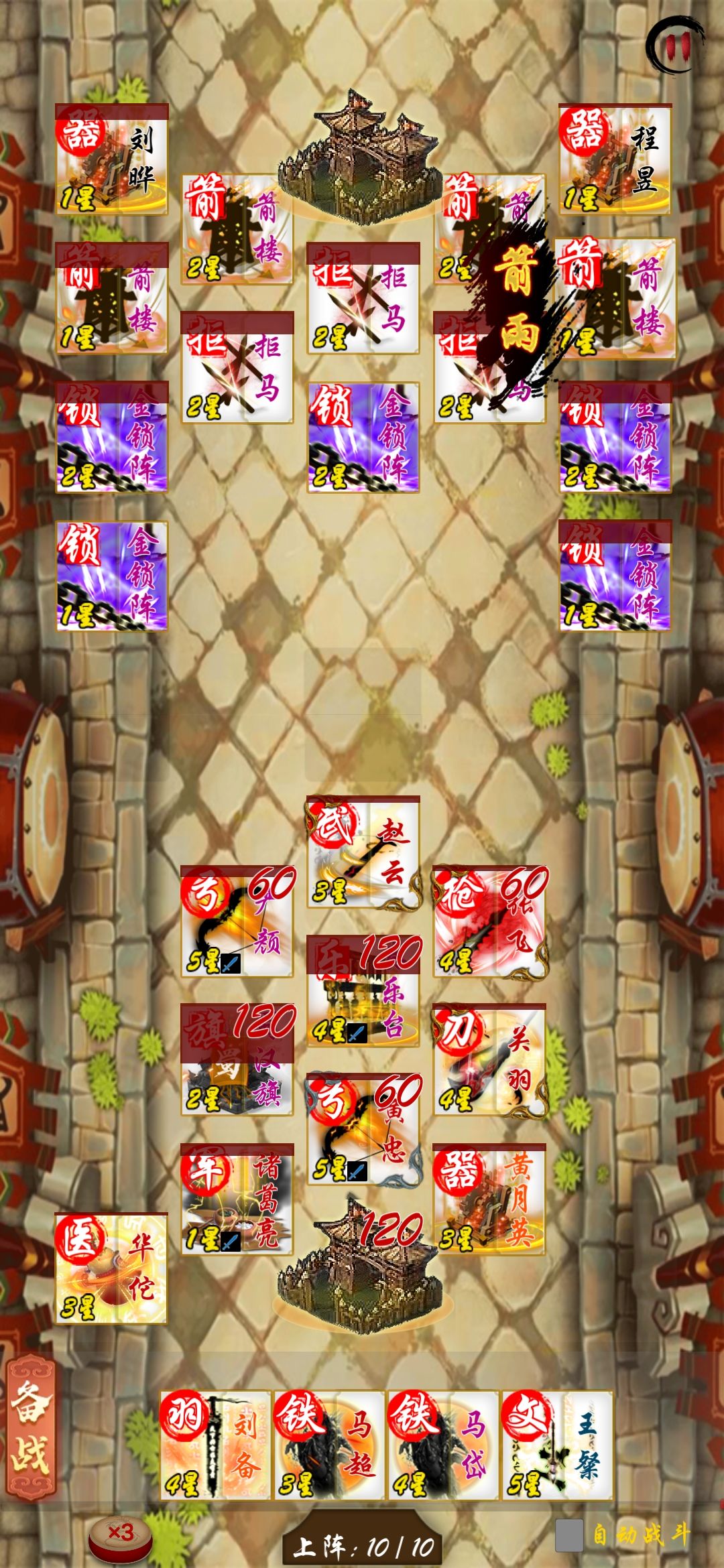 到了最后一关,只需要靠远程武将排完最后四颗雷,就能上场近战武将,火力全开。