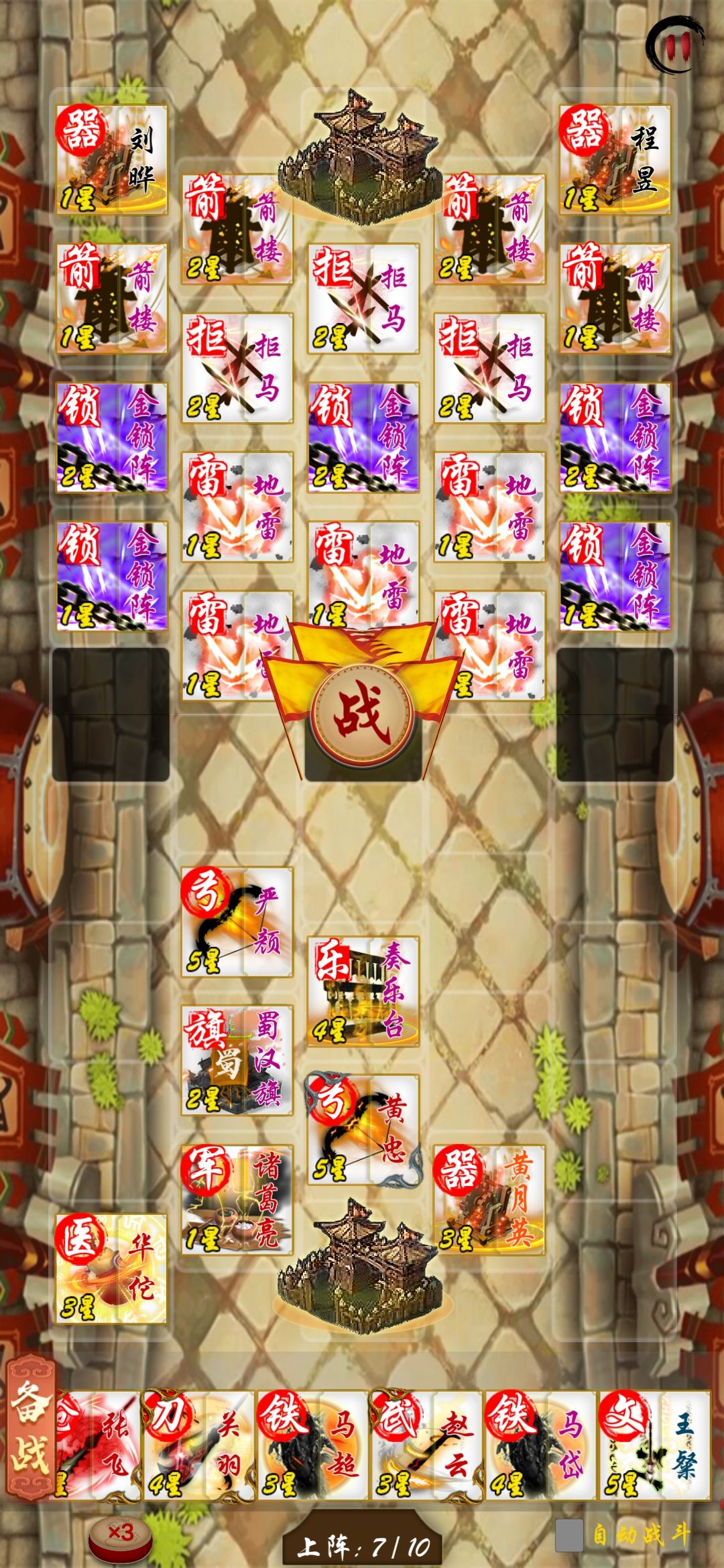分析,此关有地雷,伤害巨高,基本上一个地雷就能换我方一个近战将,因此前期几个小关,不建议上近战将,用黄忠诸葛亮,外加一个严颜排雷即可。