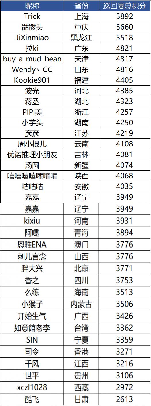 第三名的黑龙江选手“JiXinmiao”本土作战,在“哈尔滨站”的比赛中很争气的取得了5518分!也希望在他之后的所有选手都可以再接再厉,试着在周赛里突破自己,也突破巡回赛各位前辈们的极限哦~
