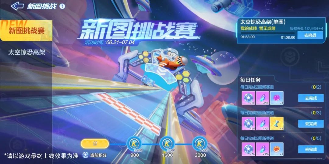 6月21日-7月4日还将开启新图挑战赛,车友们完成新图挑战,即可获得奖励和积分。奖励包括时间沙漏、紫色幸运币和橙色幸运币,其中积分可用于兑换酷币。