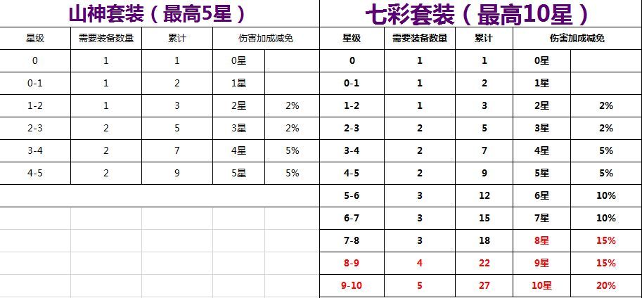 附图为山神套装、七彩套装、秘境探宝相关信息(红装升星最高15星,消耗七彩装备升星)
