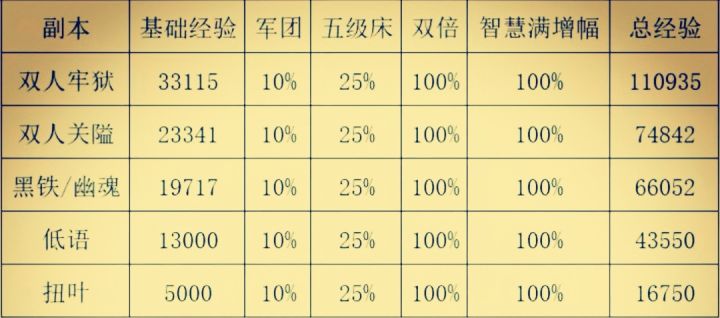经验增幅:经验本(高级时间卷轴);经验药(100%),五级床(25%),军团增益(10%),智慧之神(100%),周六(100%),古老魔药(100%)。