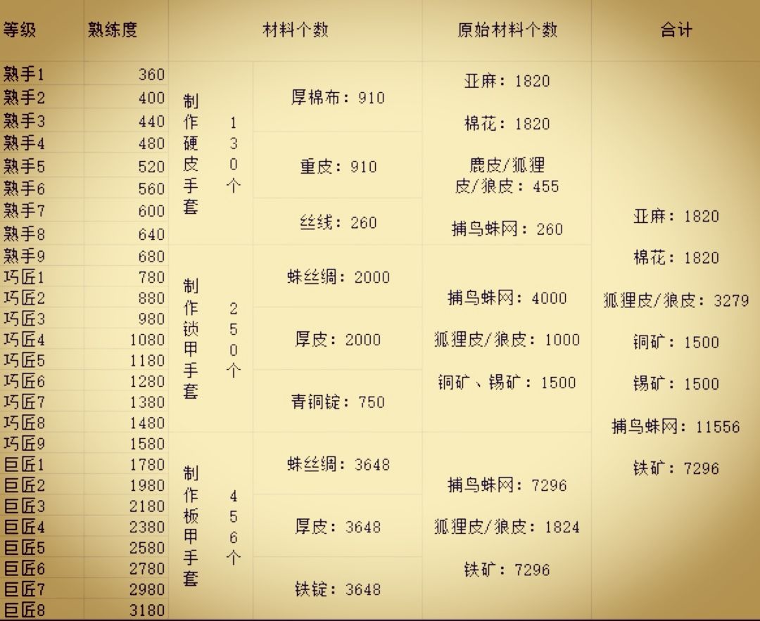 做硬皮手套升熟手8,熟手6后每种防具都做些平时使用。