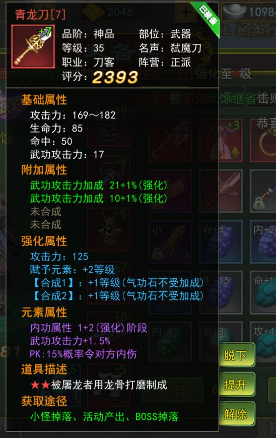 合成需求材料:金刚石/寒玉石——武器/衣服合成石材料幸运符——提升合成成功率同样是在【NPC刀剑笑】处进行装备合成,如下示例图:
