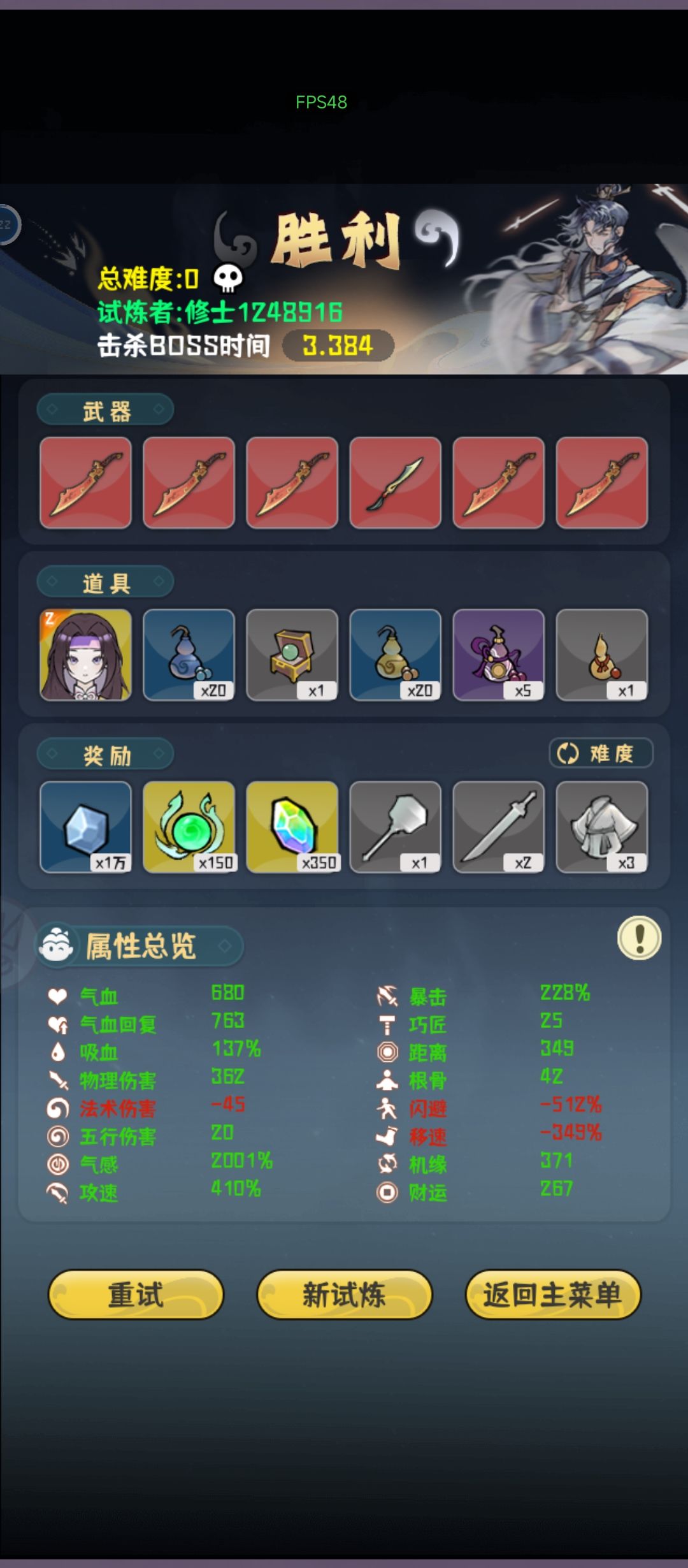 玩法思路:选择林月,聪开局就不动,一直挂机,前期通过减距离(不用怕打不着,数值没有上限,但实际上有最小攻击距离),加拾取范围,让怪都死到自己周围,来保证经济。一般到第10轮,经济就已经相当好了,后期有聚宝盆后就可以加攻击距离了。灭神刀给经济,一把飞刀解决远程怪,不然前期站不住。