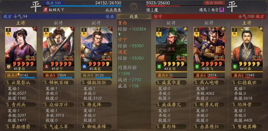 这两张战报是同一场战斗,一平一胜。红度占优势,兵种上不具备克制效果,结果同样以超低的战损打赢了对方的桃园盾。