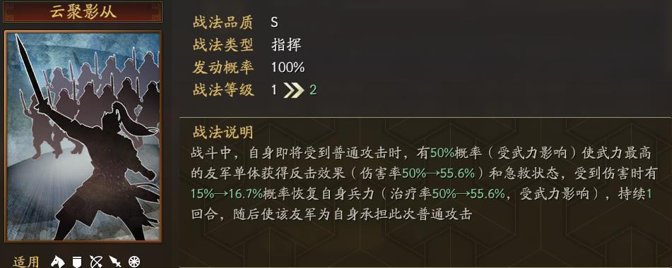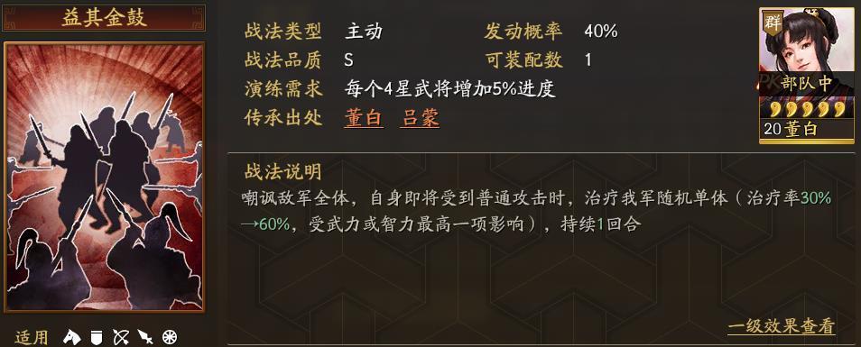 传承战法益其金鼓,是主动型嘲讽战法。与挑衅、唇枪舌战、独行赴斗的功能类似,就是挑拨全体敌人攻击自己,但是发动概率偏低,只有40%。B级战法挑衅是纯粹的挑拨,发动率60%。A级战法唇枪舌战、S级战法独行赴斗的发动率是50%,相比而言弱了一些。附带的治疗功能也只有60%,而且是针对单体,受益不大。目前这战法很少使用,也许后期会增强,有更多的机会让武将携带吧。
