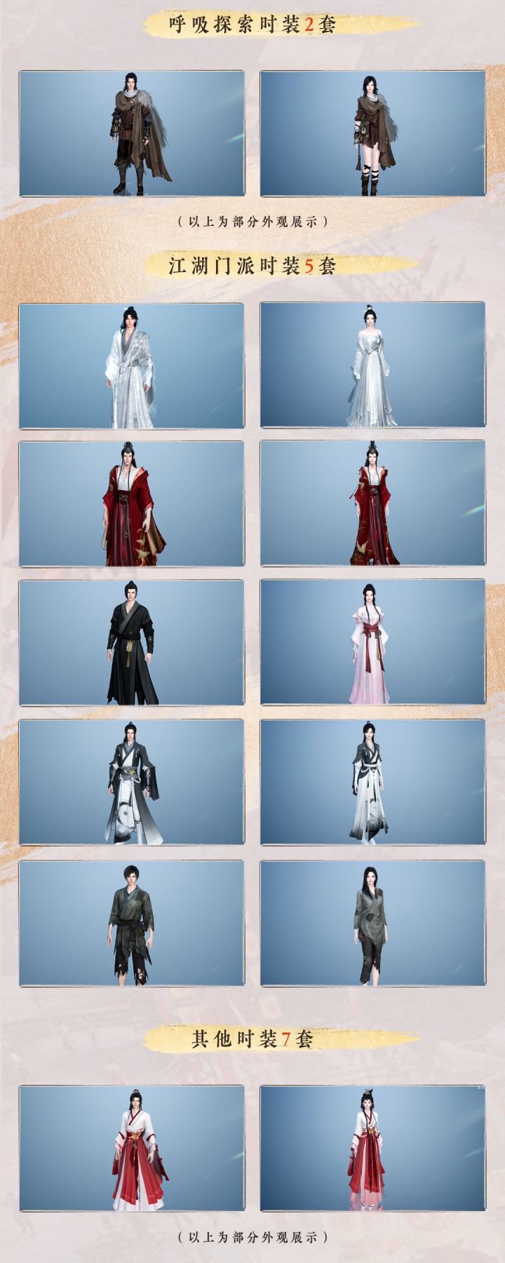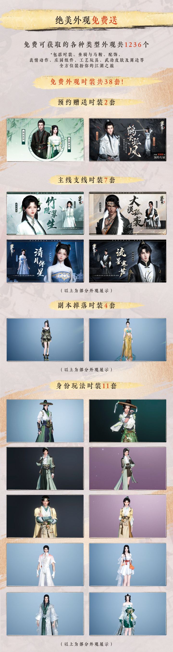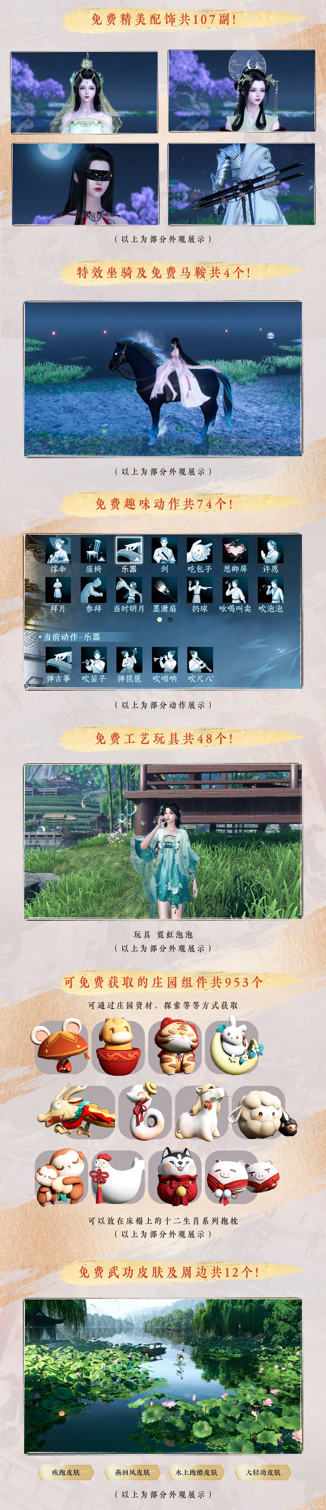 ※1236种免费外观:包括38套时装、107种配饰、953种庄园组件、74种趣味动作、48种工艺玩具、12种武功皮肤及周边,全方位装扮你的江湖之旅