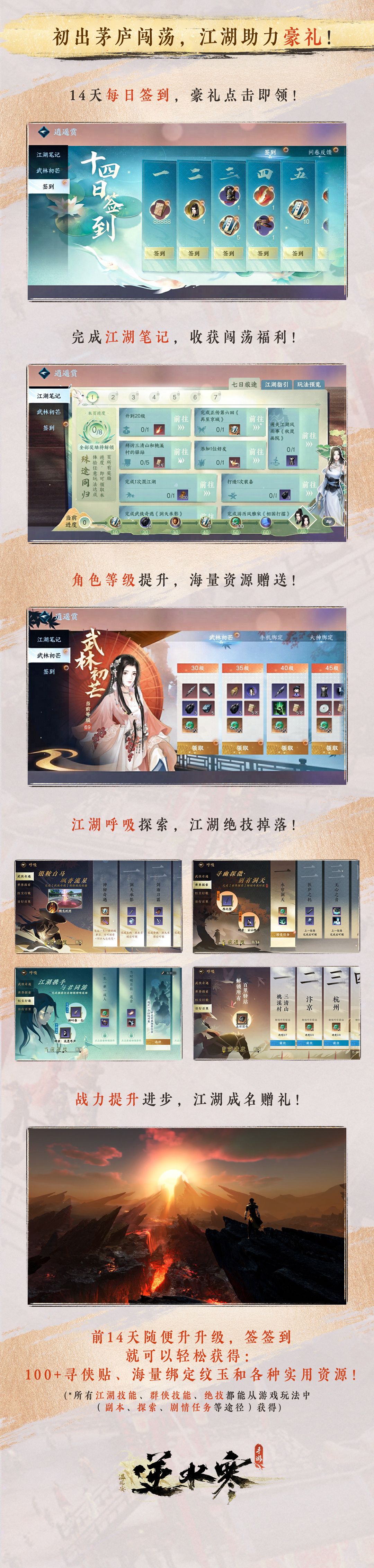 ※海量可获取资源:前14天简单升级签到探索 即可获取100+寻侠贴、大量绑定纹玉(可轻松搬空绑元商城所有时装 )