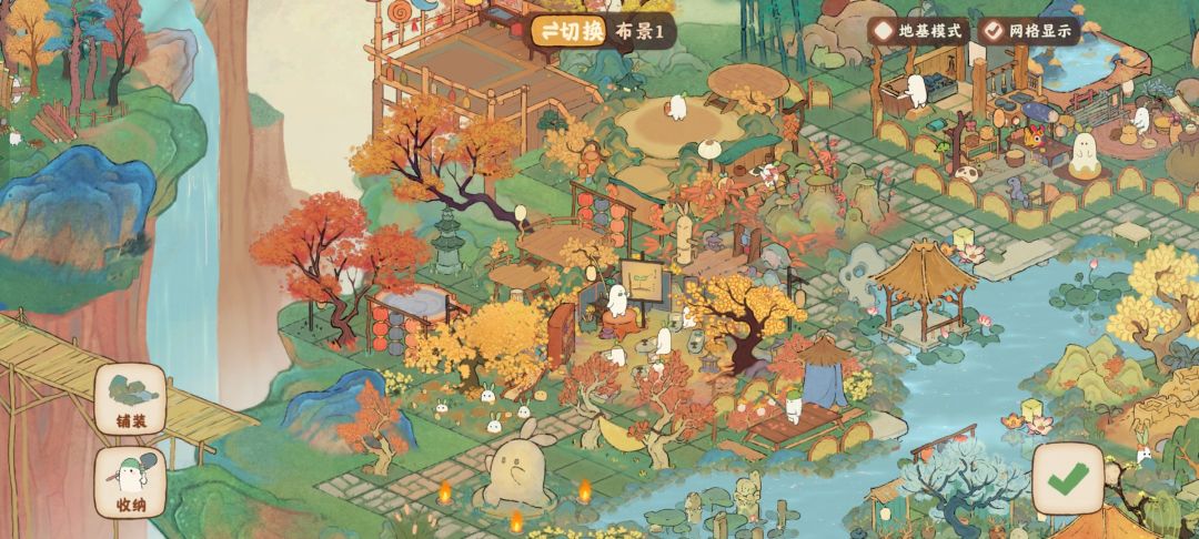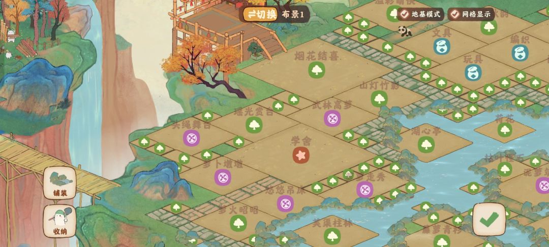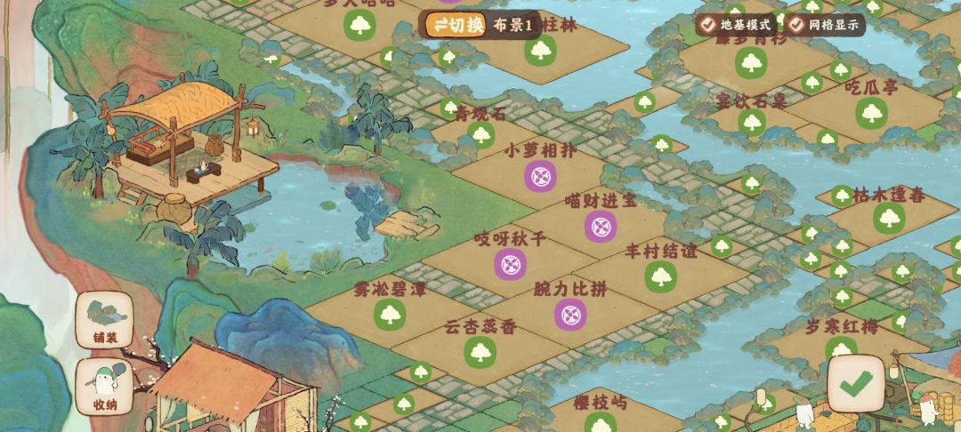 。走过小桥来到二岛,左侧是放灯台,以黄色系为主,用甲等烟花台和乙等瑶台衔接,突出层次感,加上萝萝学社及萝卜坑等一众娱乐建筑,增加动感。最后用一系列暖色装饰修边补空。