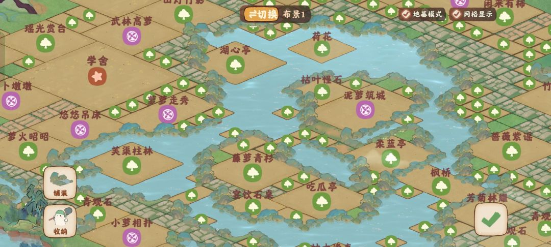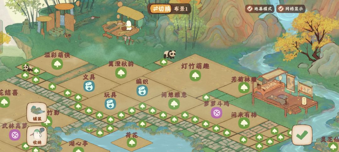 息壤往上是沿溪小路,周围用花草树木石山点缀,突出自然风格。再上便是伪装成农家小院的愈画斋,还有被竹制品工坊包围的竹林,还特意在竹林边上放了一张摇椅,方便监工