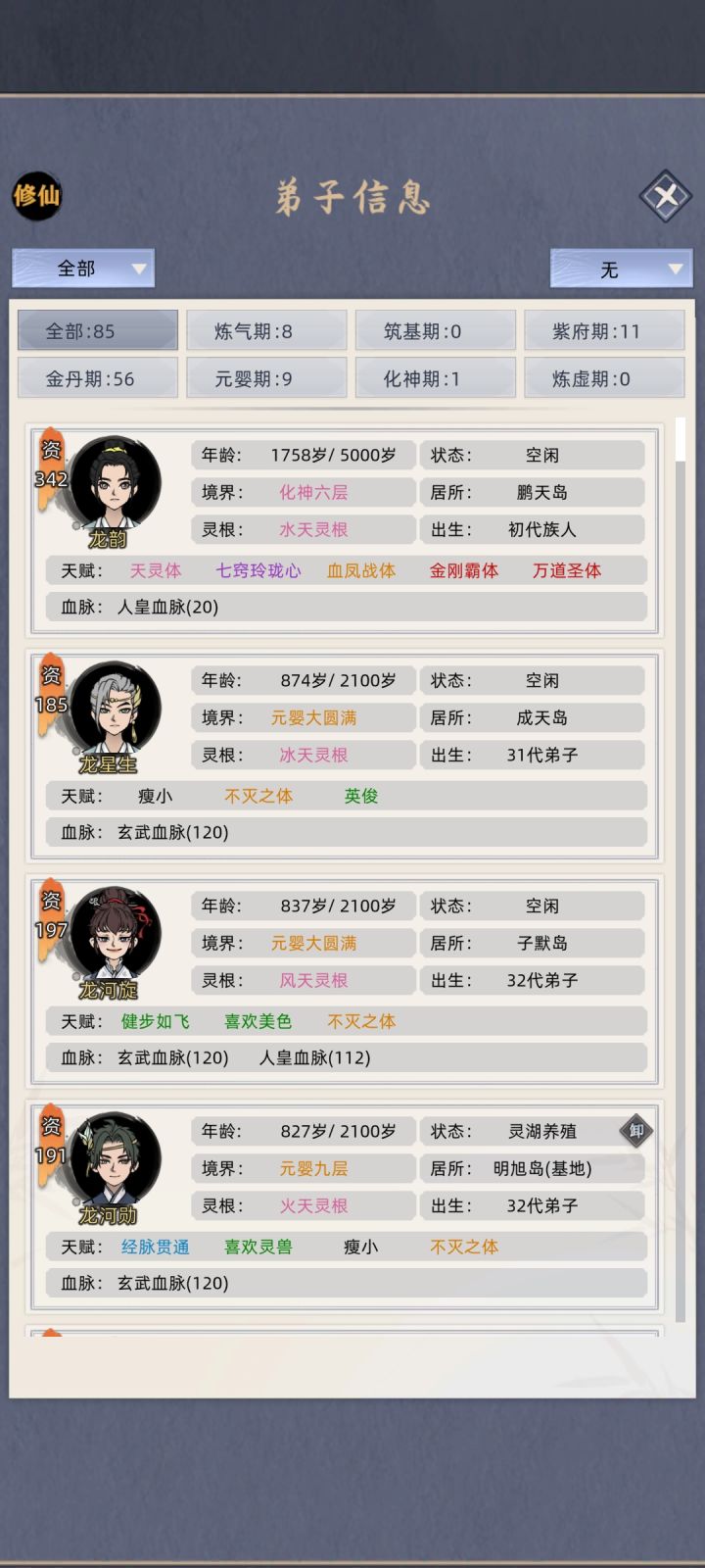 这里要用九龙丹(大概三四个),把拥有两个血脉的弟子结合,sl出四血脉(浓度大于七八十即可),不同的父母生五六个,然后互相杂交。(九龙丹或者最简单的练气阶段sl)