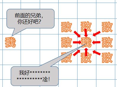 假设敌我军两人,敌军八人,攻击距离均为九宫格