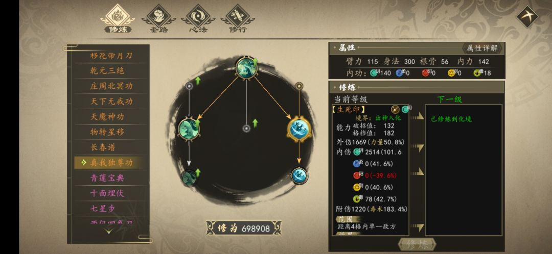 点亮两个招式后,到长春谷练武场下面石像后面点点点,可解锁生死符。