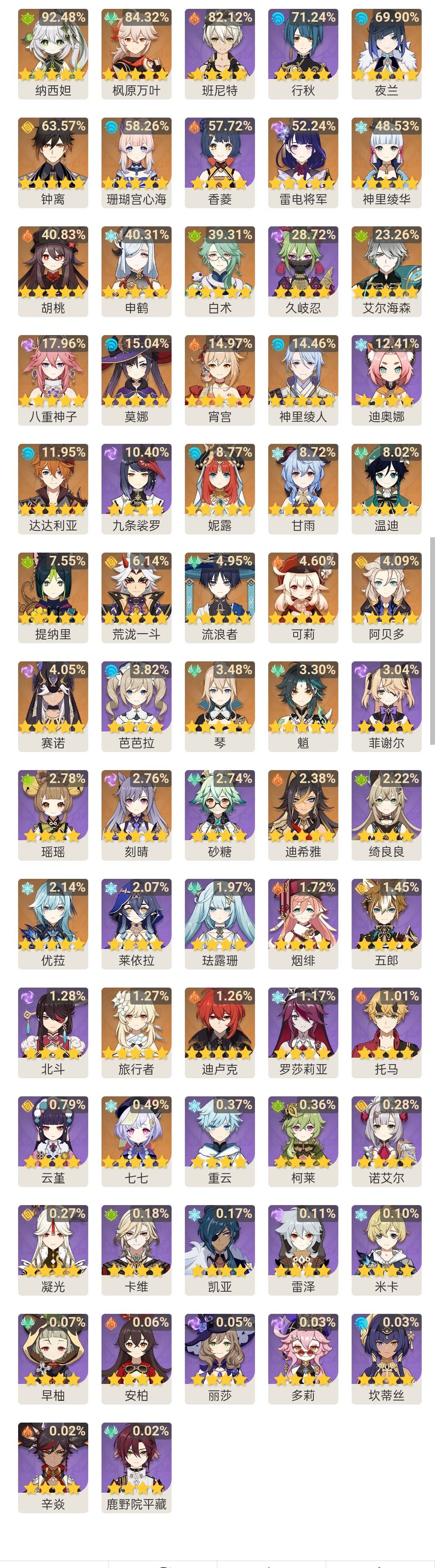 T1:行秋(71%)、夜兰(70%)、钟离(64%)、珊瑚宫心海(58%)、香菱(58%)、雷电将军(52%)、神里绫华(49%)