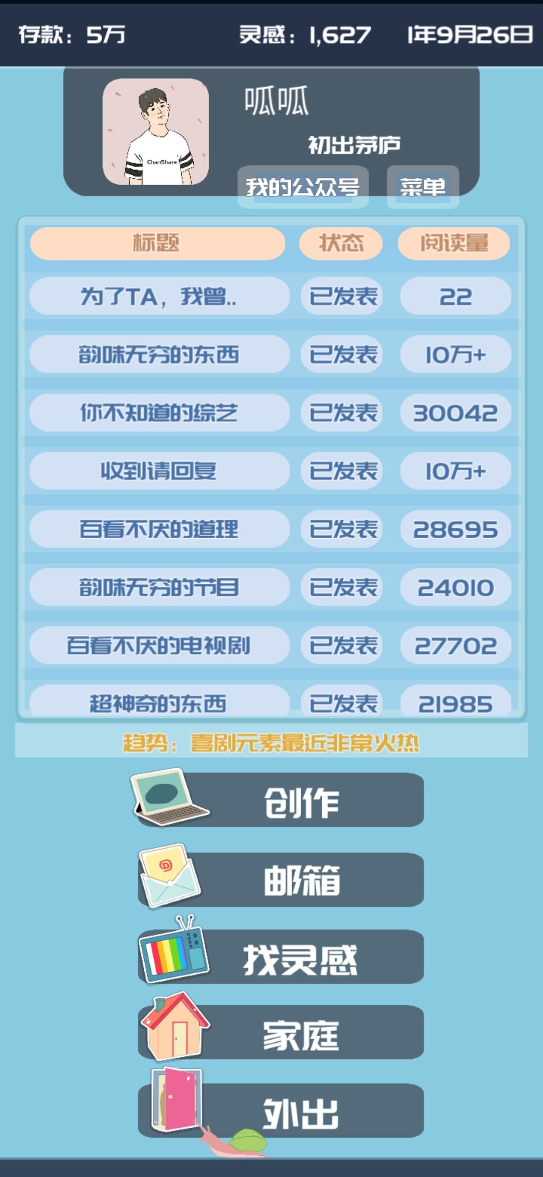 1.入坑是因为自己开过公众号,作为一个在校医学生,运营比较麻烦,没有那么多时间去写稿和运营,就放弃了,所以看到这个游戏,挺戳我的,就选择玩了