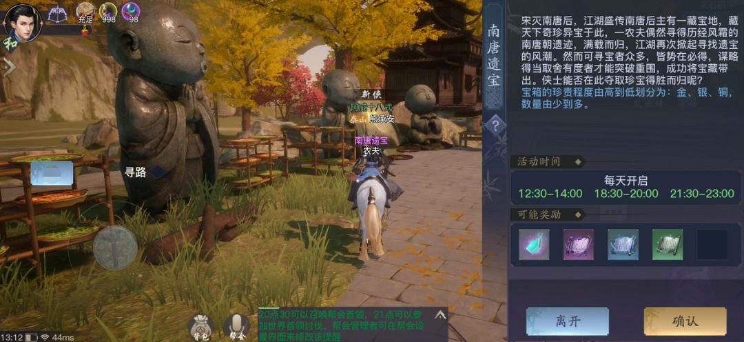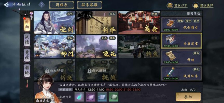 开启时间:每天开启,12:30-14:00,18:30-20:00,21:30-23:00,在开启时间内,玩家可以在采石矶地图,点击南唐遗宝专属活动NPC农夫参与活动。