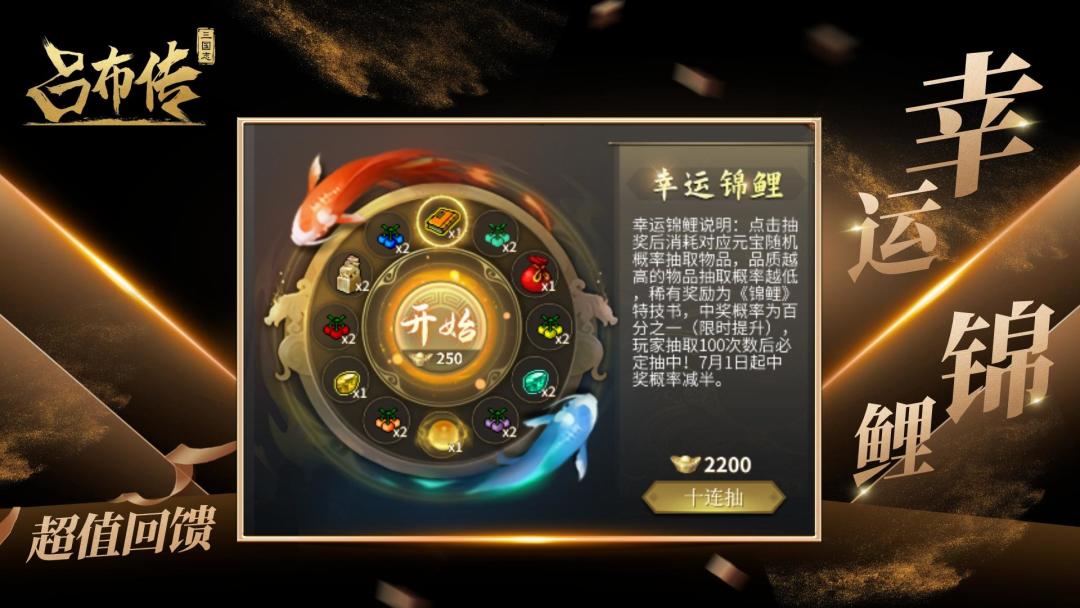 感谢您对《三国志吕布传》的长久支持与喜爱,为了更好的回馈于您,游戏福利界面即将上线【幸运锦鲤】转盘新功能,点击抽取有机会获得活动专属新品/稀有材料~![[TapFamily_爱了]](https://img.tapimg.com/market/images/bec74199d492d5d2ad12c434aac536aa.gif)