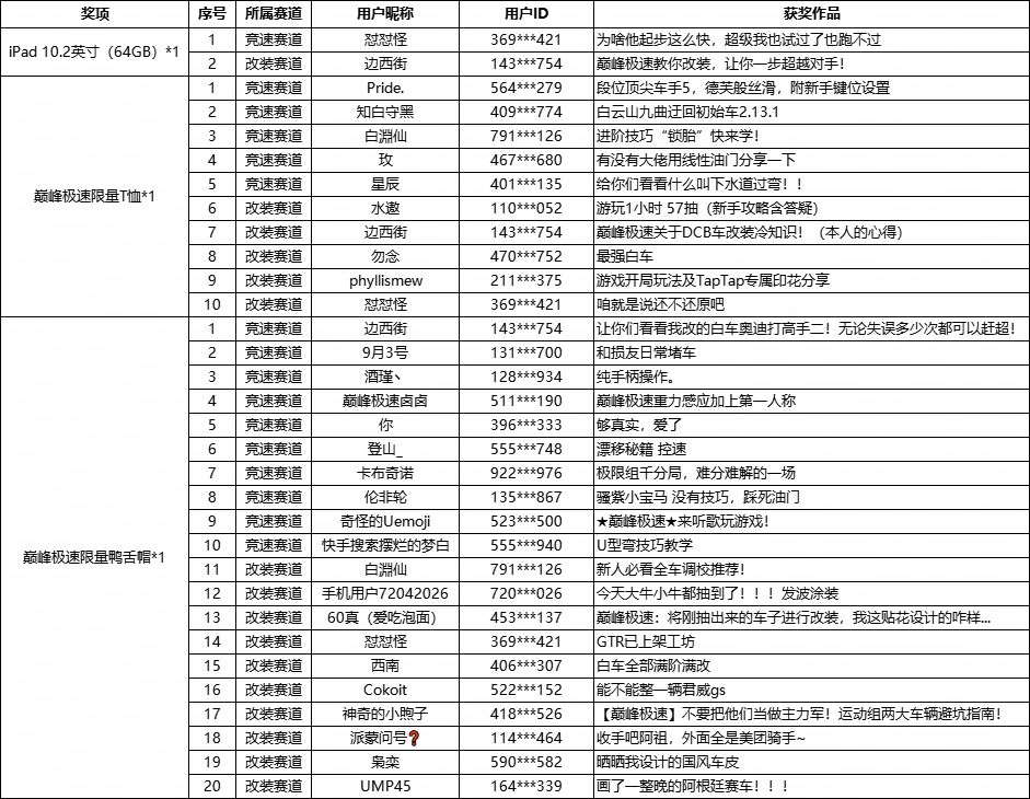 请各位玩家在公示期内尽快核对信息,公示期结束后,请获奖赛车手在公示期结束后7个工作日内添加联系方式QQ:565469107(备注获奖渠道+游戏名称+奖品)兑换奖励哦!