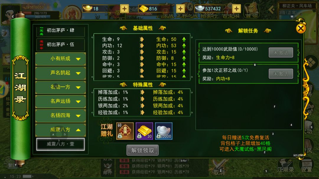 在上一次更新后也是出了一个新的系统玩法-江湖录,完成江湖录指定任务不仅可以获得丰厚的物资还可以提升攻击、命中等各项人物属性。而且后续开放的天魔试炼也是需要江湖录达到指定等级,天魔试炼中也是有非常高的概率可以给我获取神品装备的机会。