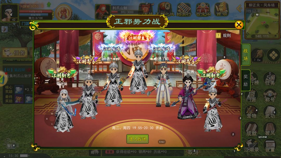 正邪之战需要28级以上才能加入战场,正派和邪派各限100人。如果战场开启后对应阵营的数量还没有达到上限,仍然可以通过进入战场页面进入游戏。在游戏中杀死敌人可以为玩家、怪物和敌对阵营的首领获得积分。战场时间结束后,总点数高的势力获胜。
