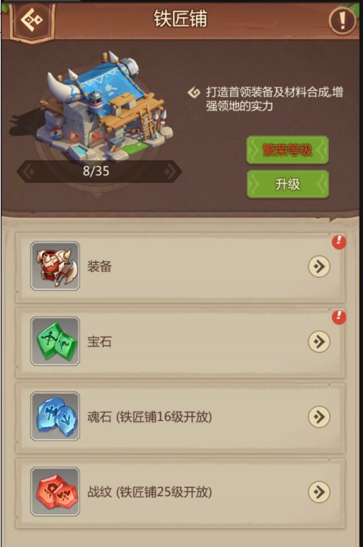 解析:首领可穿戴战争装、建造装、研发装在内的3套装备,可大幅提升自身实力,可通过强化、升星等方式进行培养。