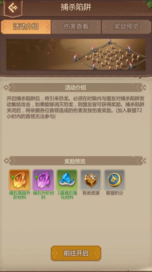 选定捕杀陷阱需要加入联盟才可以参与,活动开启当天盟主和官员开启活动。由于是整个联盟参与的活动,建议安排在晚上8点至10点间进行开启,确保各个成员都有空闲时间参与。