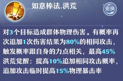 但是,如果大圣是10力加点满培养,【如意棒法】就有45%的概率进行80%伤害的相同技能追击,洪荒觉醒后概率将提升到55%,非常接近物连的概率了。并且追击还有15%的临时暴击提升,是目前暴击率最高的神兽。