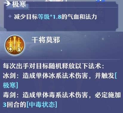 剑灵专属技【干将莫邪】的效果看起来比较直接明了,冰剑和毒剑随机一发,其中冰剑附带专属效果【极寒】(不是寒冷异常),减少目标等级*1.8的血和蓝。按照74级的灵兽目标,数值是133。